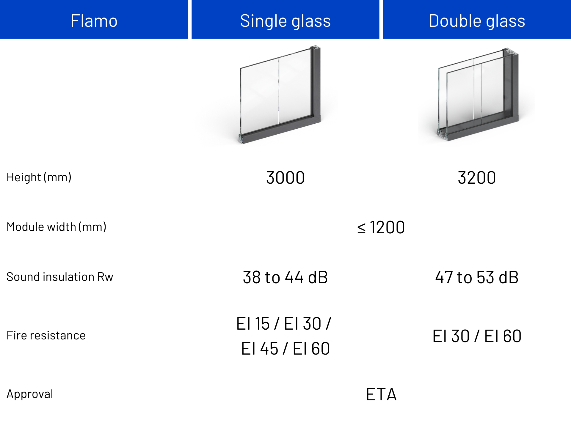 There is a choice of variants with single or double glazing, with fire resistance in the range of EI 15 to EI 60. Flamo Design is the ideal choice for offices, schools, medical facilities and representative spaces where elegant appearance, safety and acoustic comfort are important.