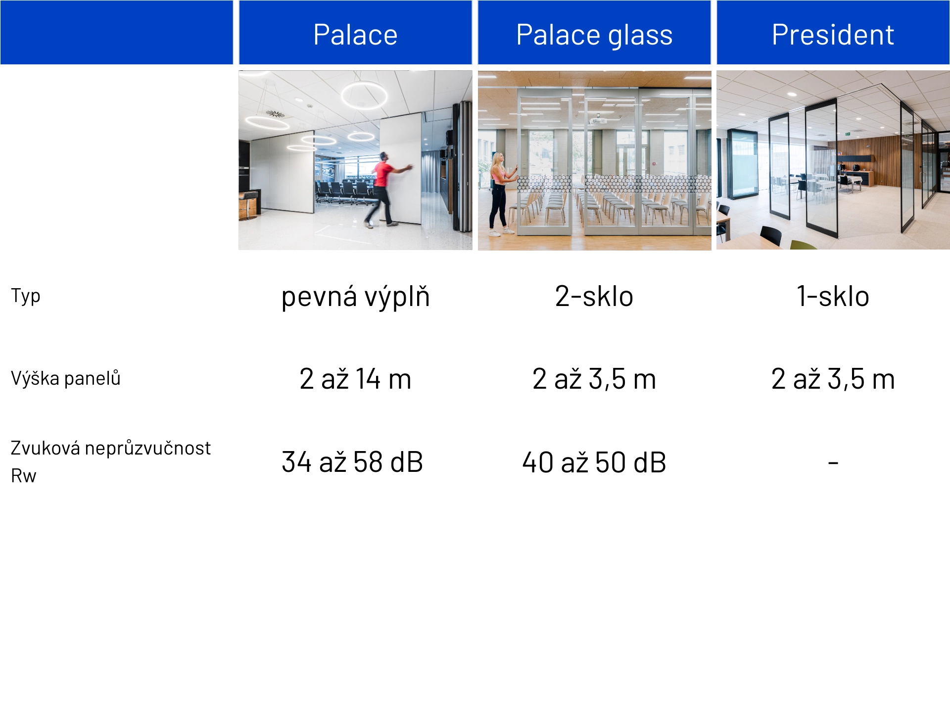 Vybírat můžete z plných akustických stěn Palace, které zajišťují maximální soukromí, skleněných akustických stěn Palace Glass, které kombinují světlo a ticho, nebo jednoduchých bezrámových stěn President, které interiéru dodají vzdušnost a lehkost.