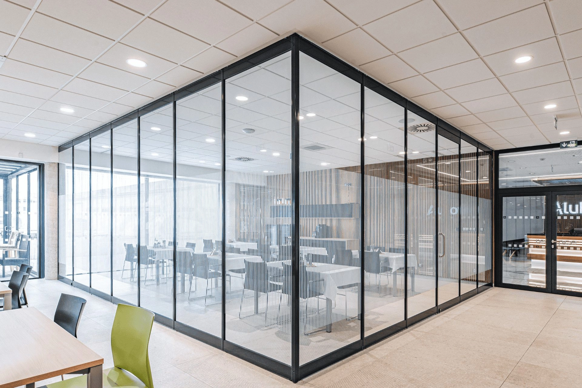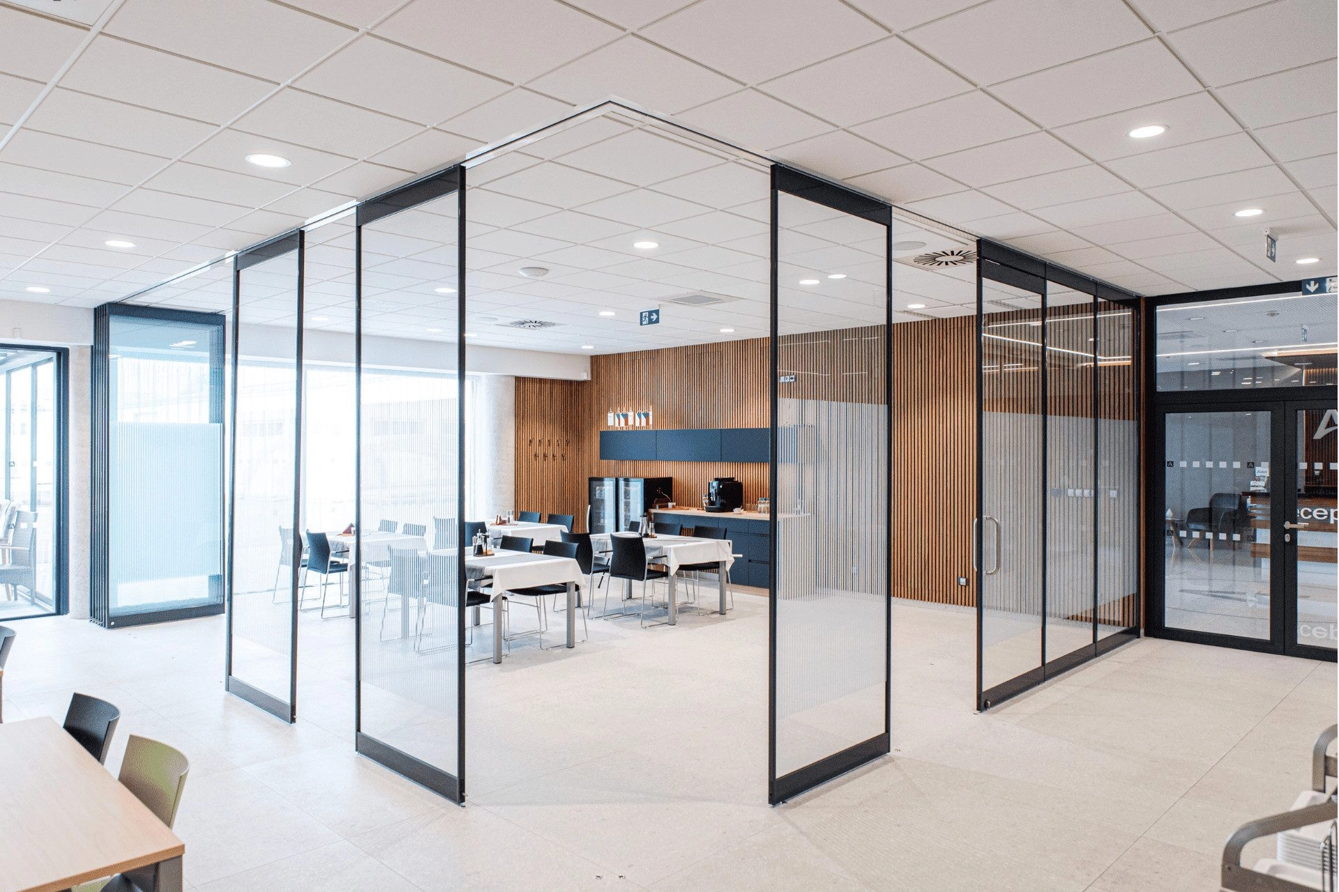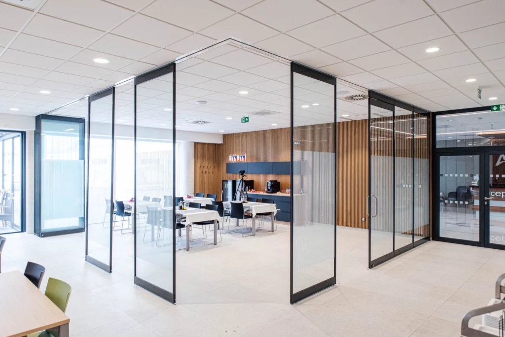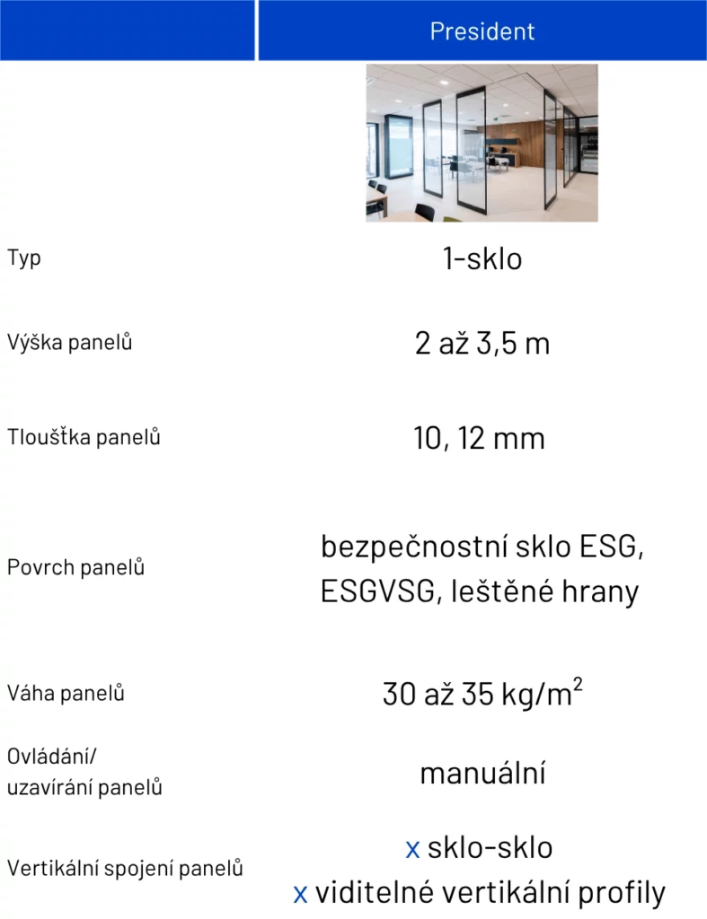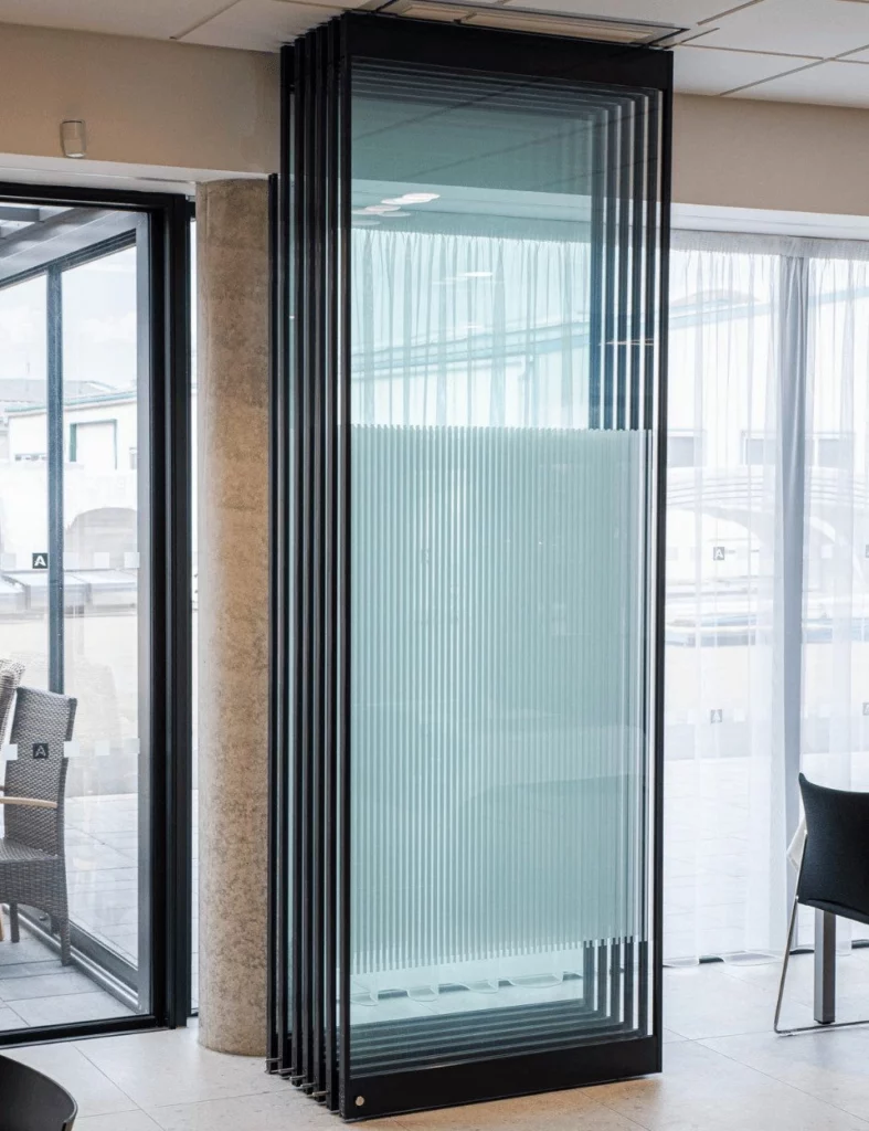 Panely z jednovrstvého bezpečnostního skla s leštěnými hranami působí mimořádně lehce a vzdušně, přesto zajišťují pevnost a funkčnost při běžném provozu. Výška panelů může dosahovat až 3,5 metru, což umožňuje elegantní rozdělení prostoru i ve větších místnostech.