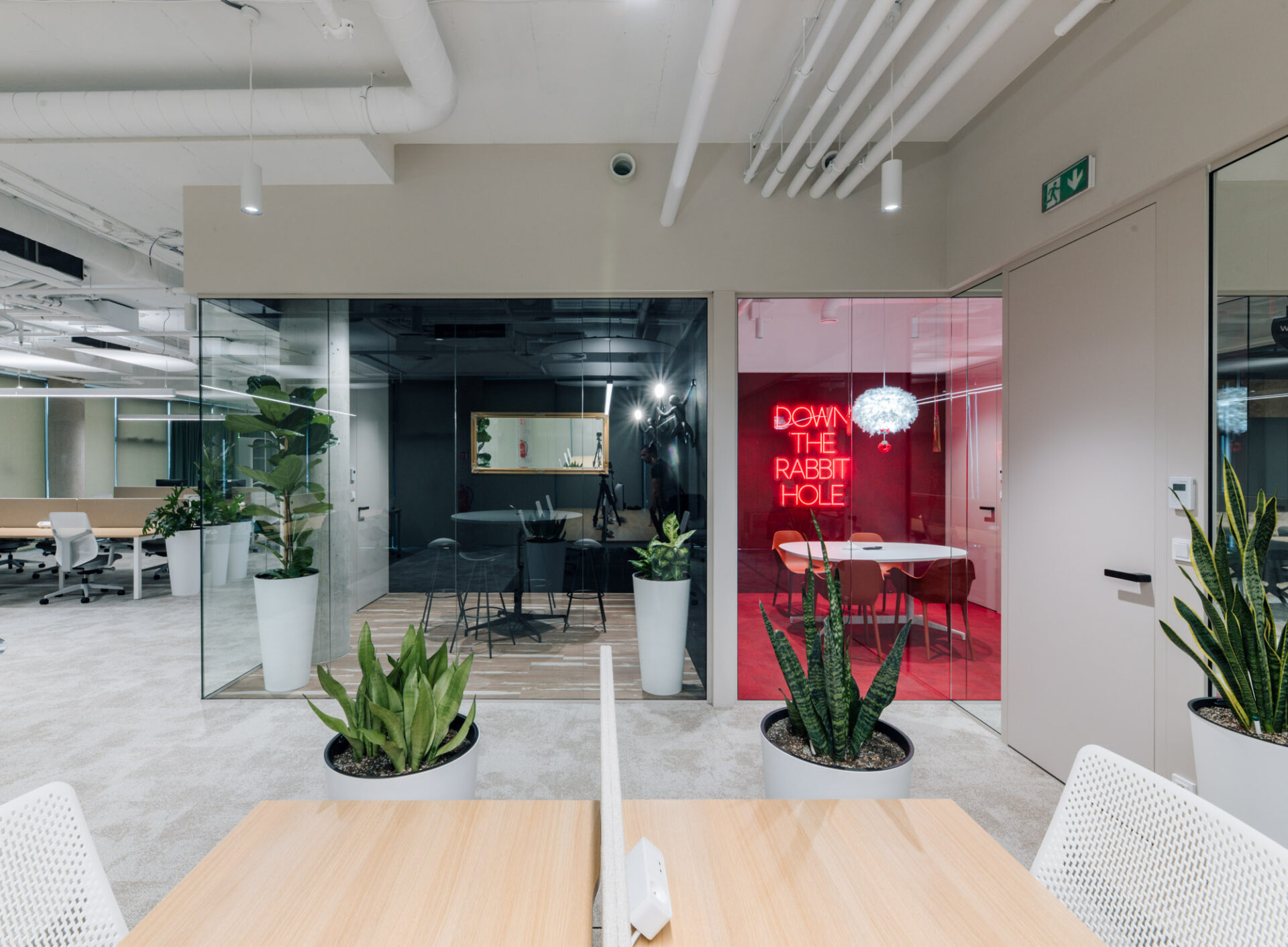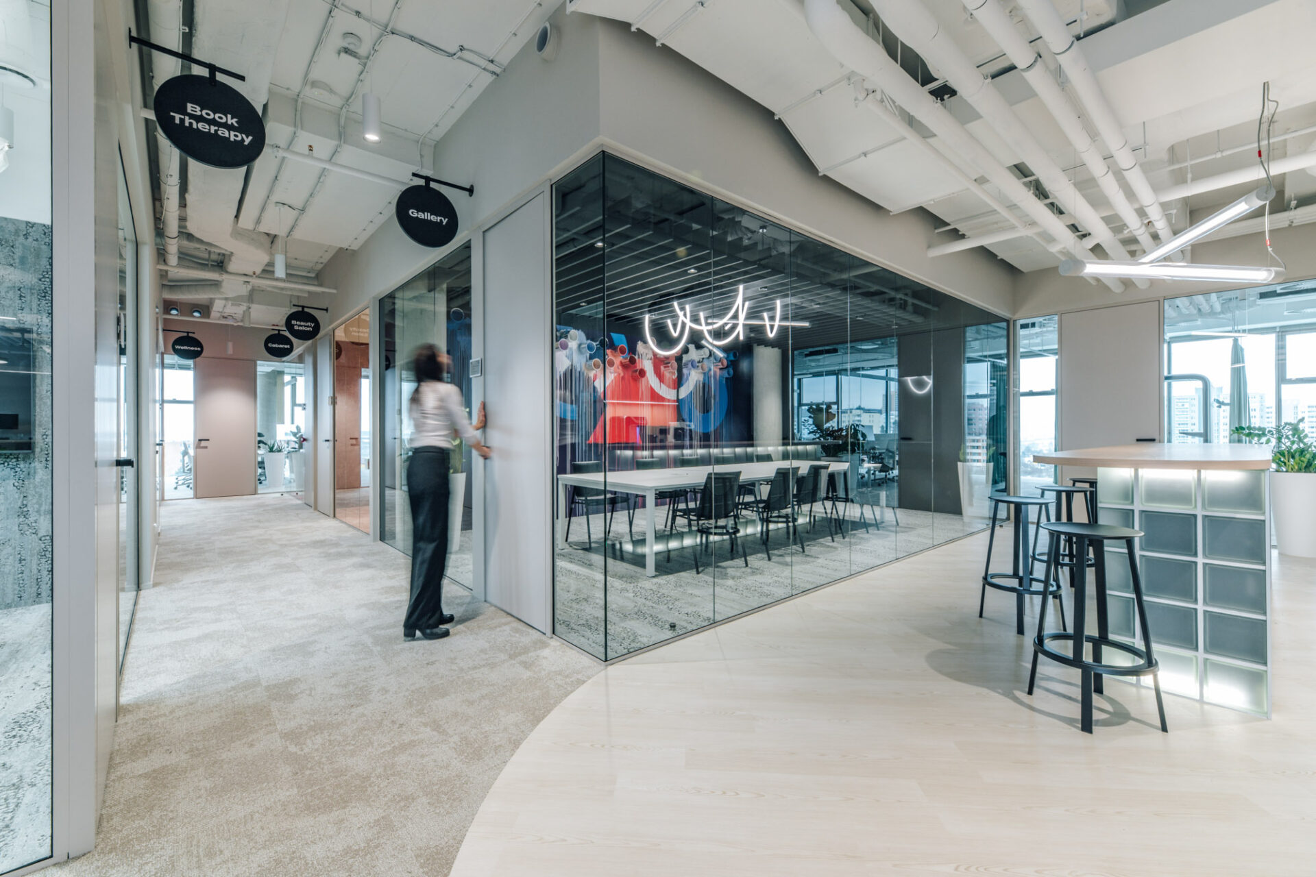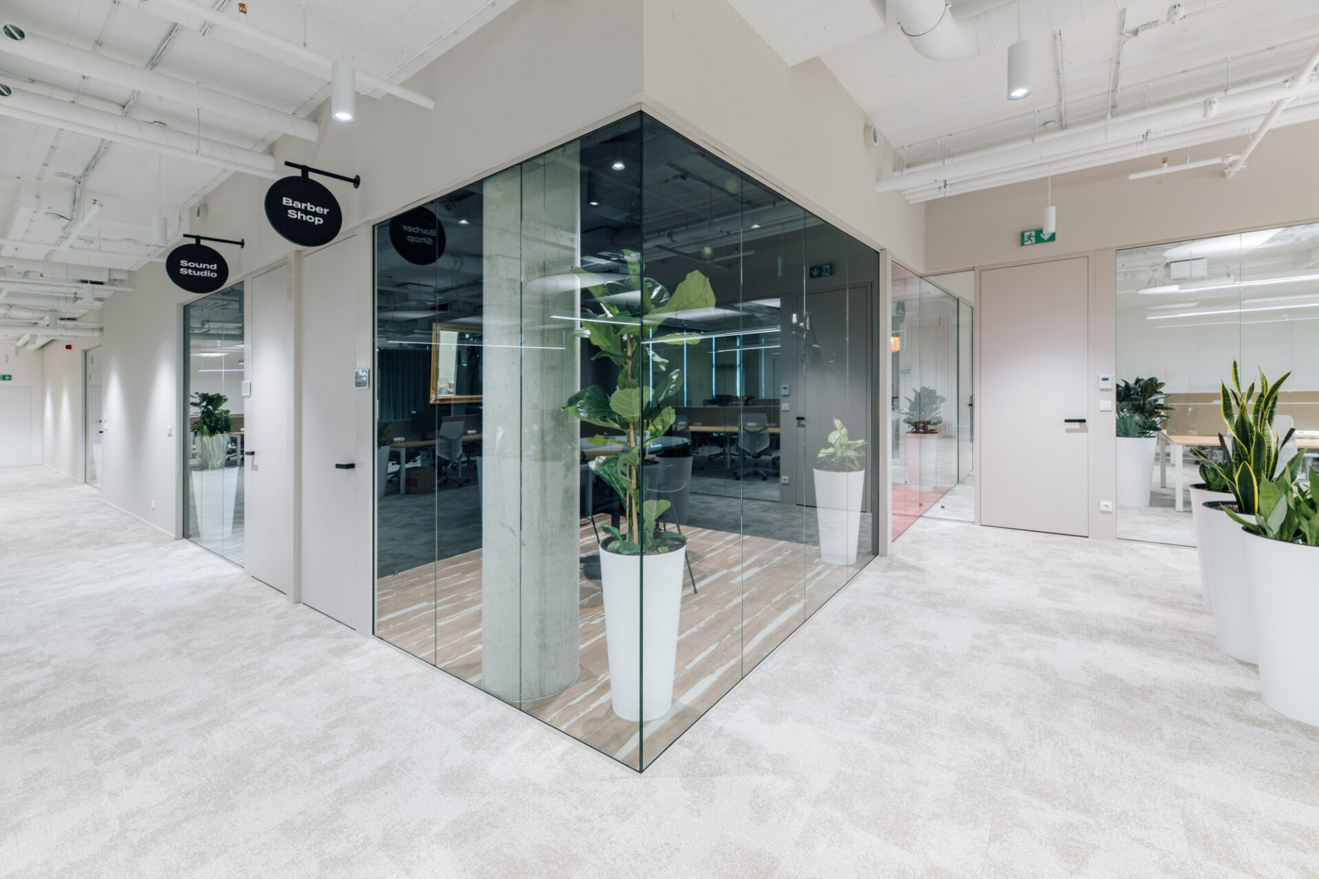 Najdete tu galerii, wellness a beauty salon, sound studio i kabaret s pouličním poutačem. Zasedací místnosti jsme oddělili prosklenými stěnami, prosklená stěna ze strukturovaného skla Raywall elegantně ohraničuje relax zónu s fotbálkem.