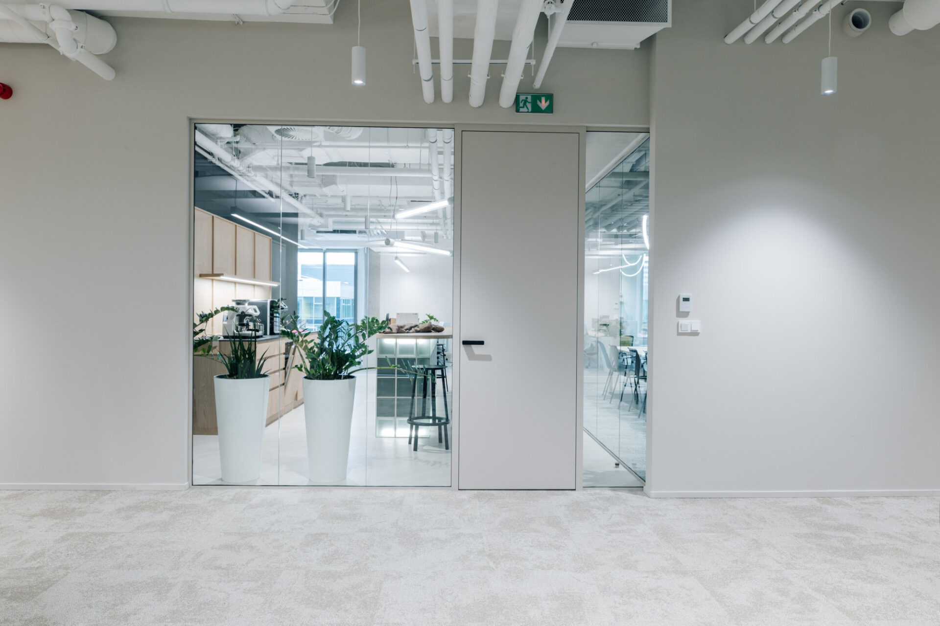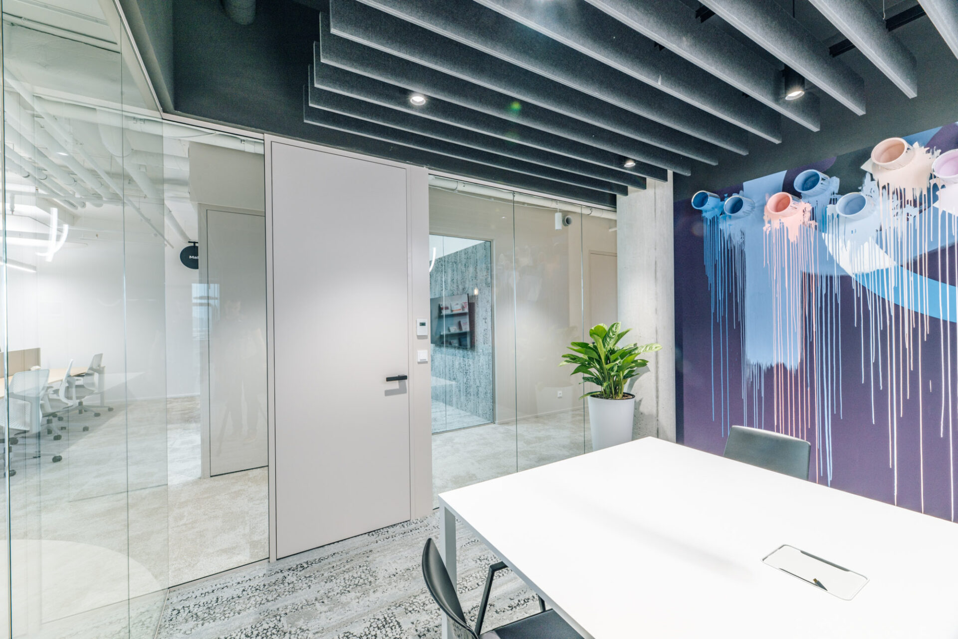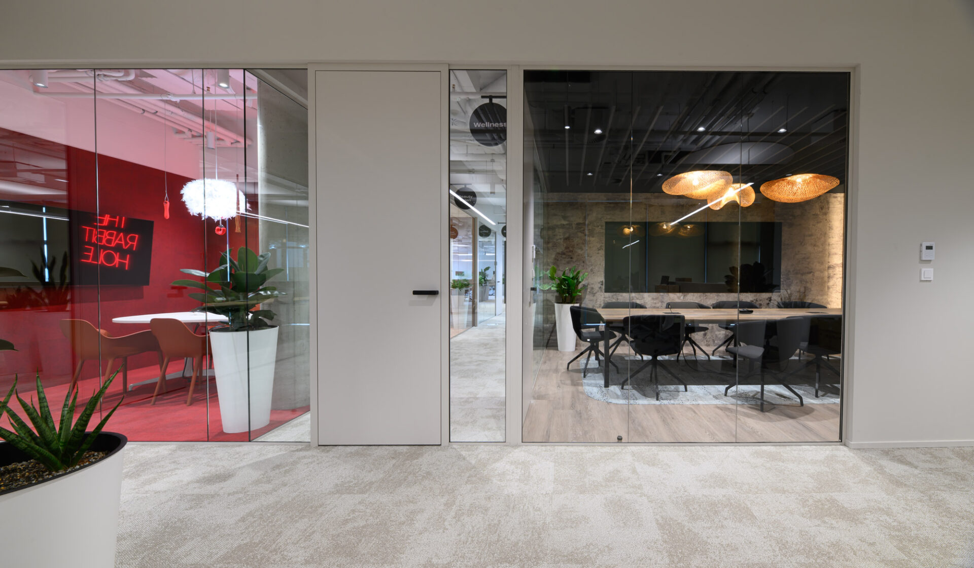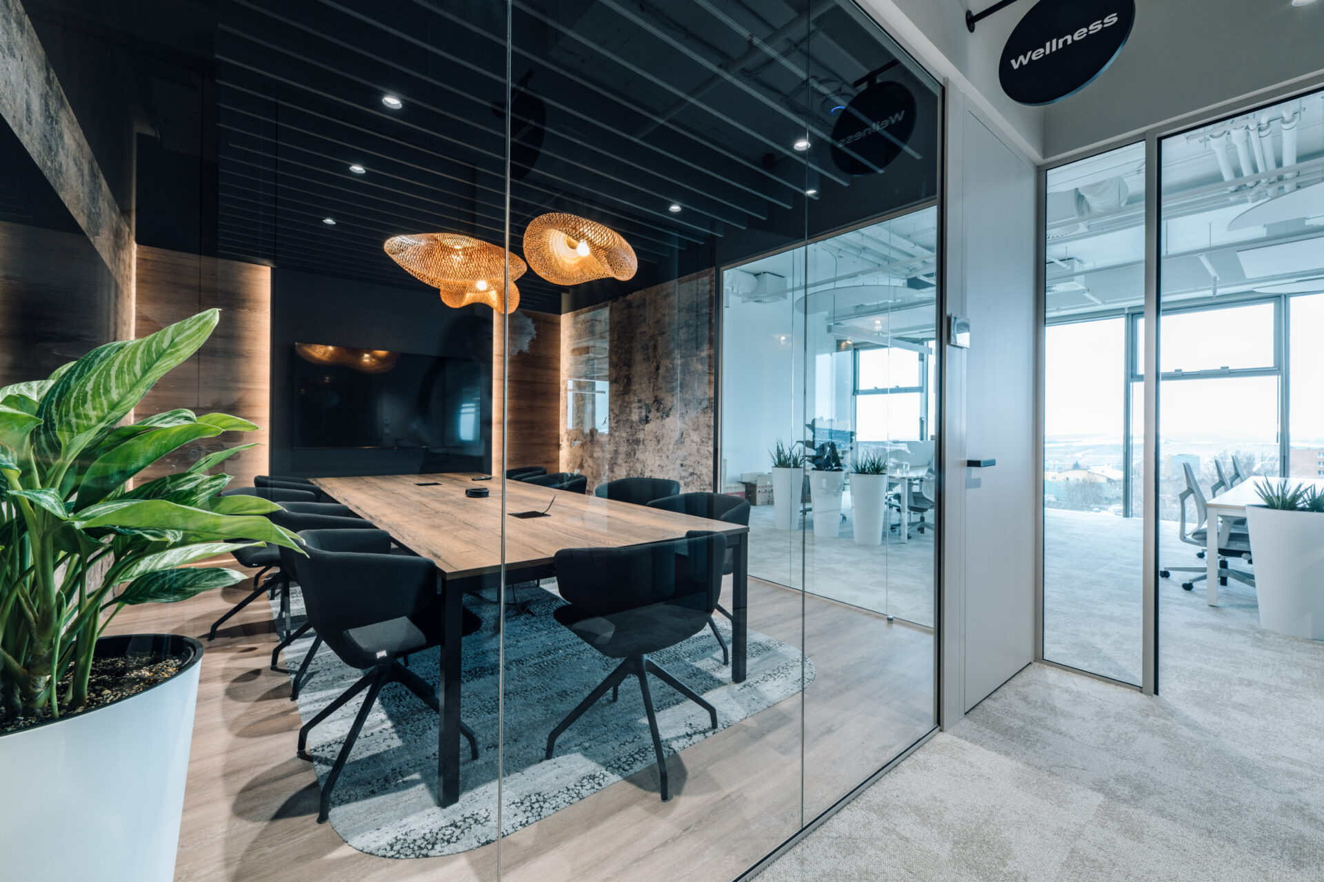 Najdete tu galerii, wellness a beauty salon, sound studio i kabaret s pouličním poutačem. Zasedací místnosti jsme oddělili prosklenými stěnami, prosklená stěna ze strukturovaného skla Raywall elegantně ohraničuje relax zónu s fotbálkem.