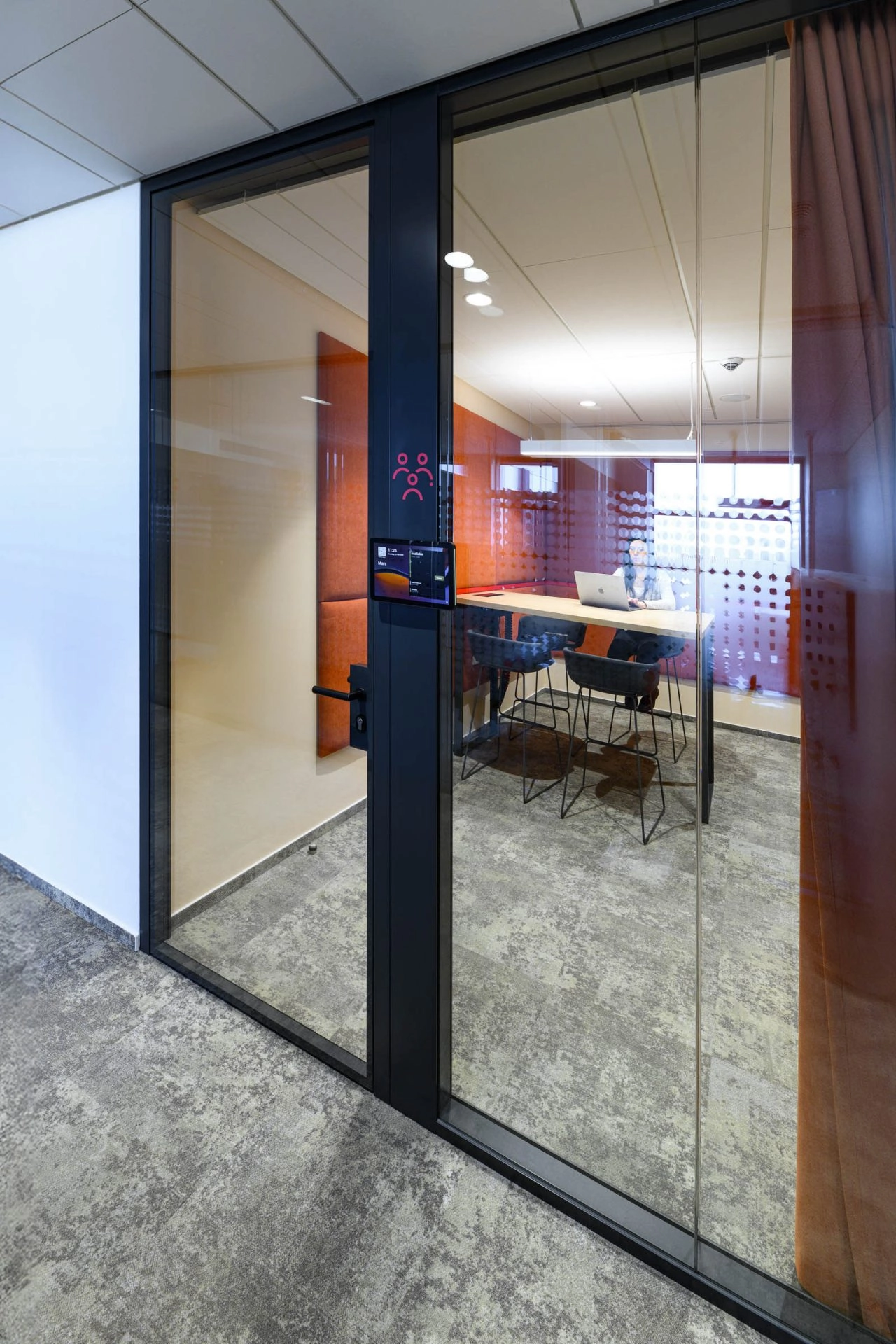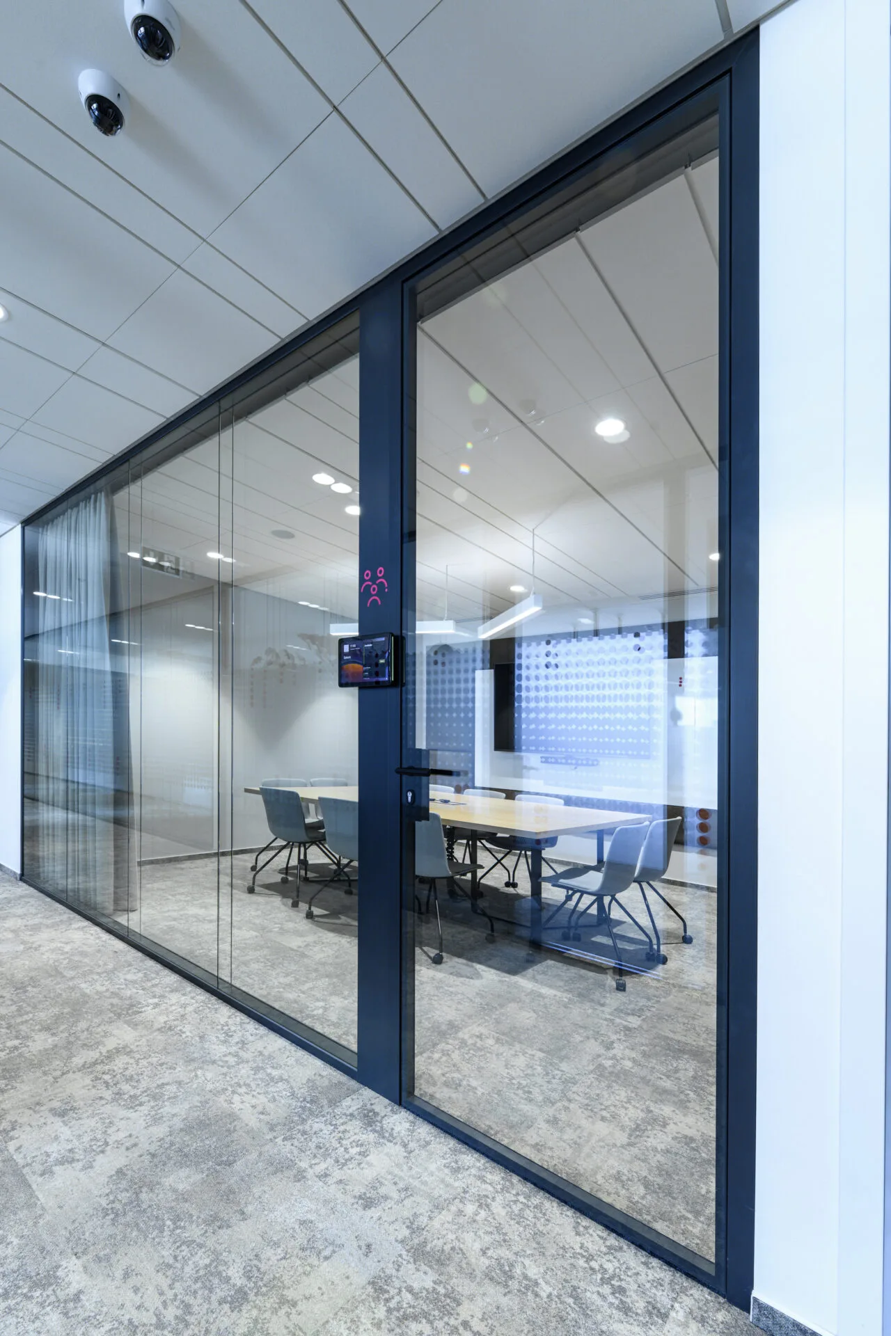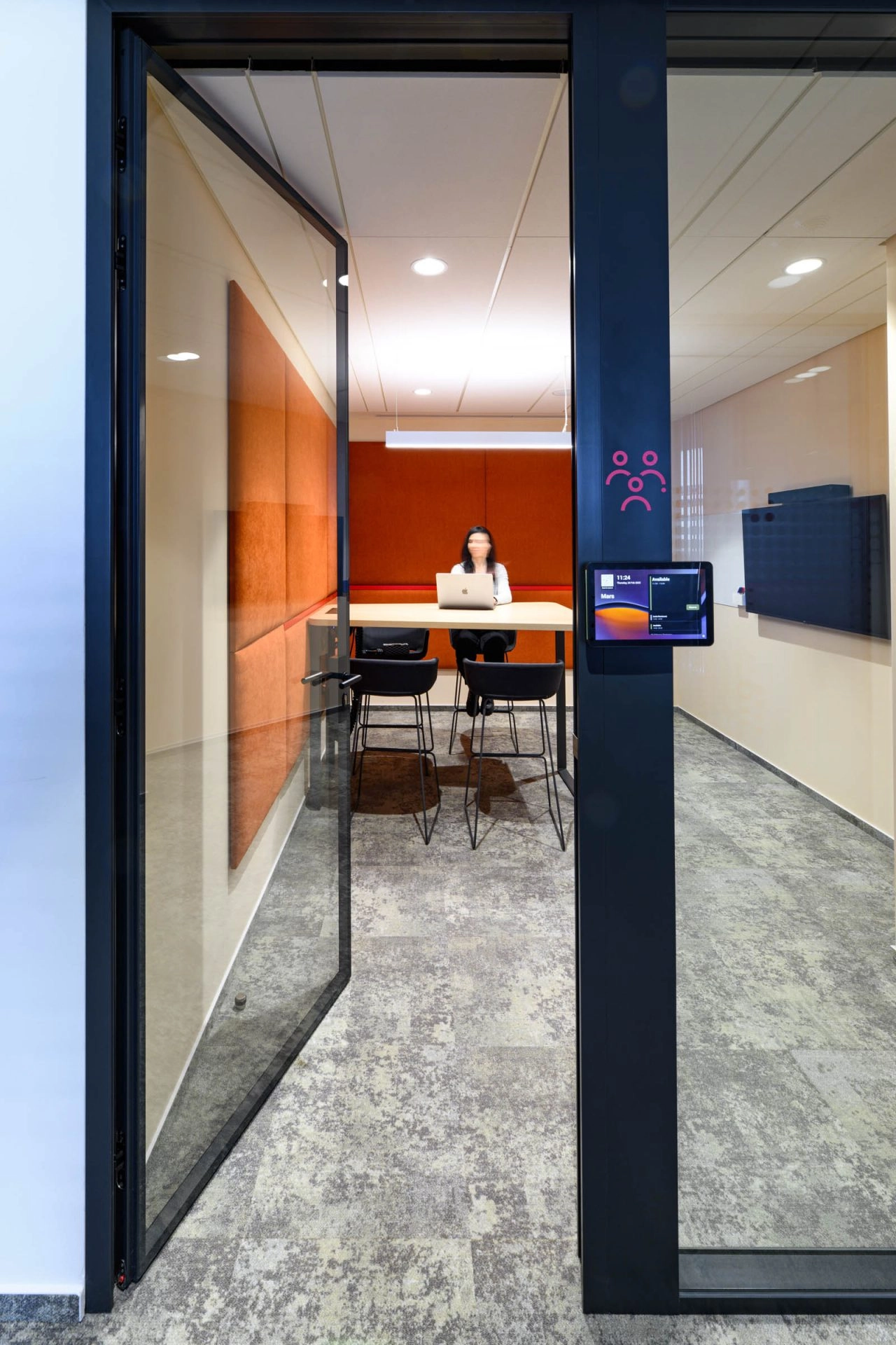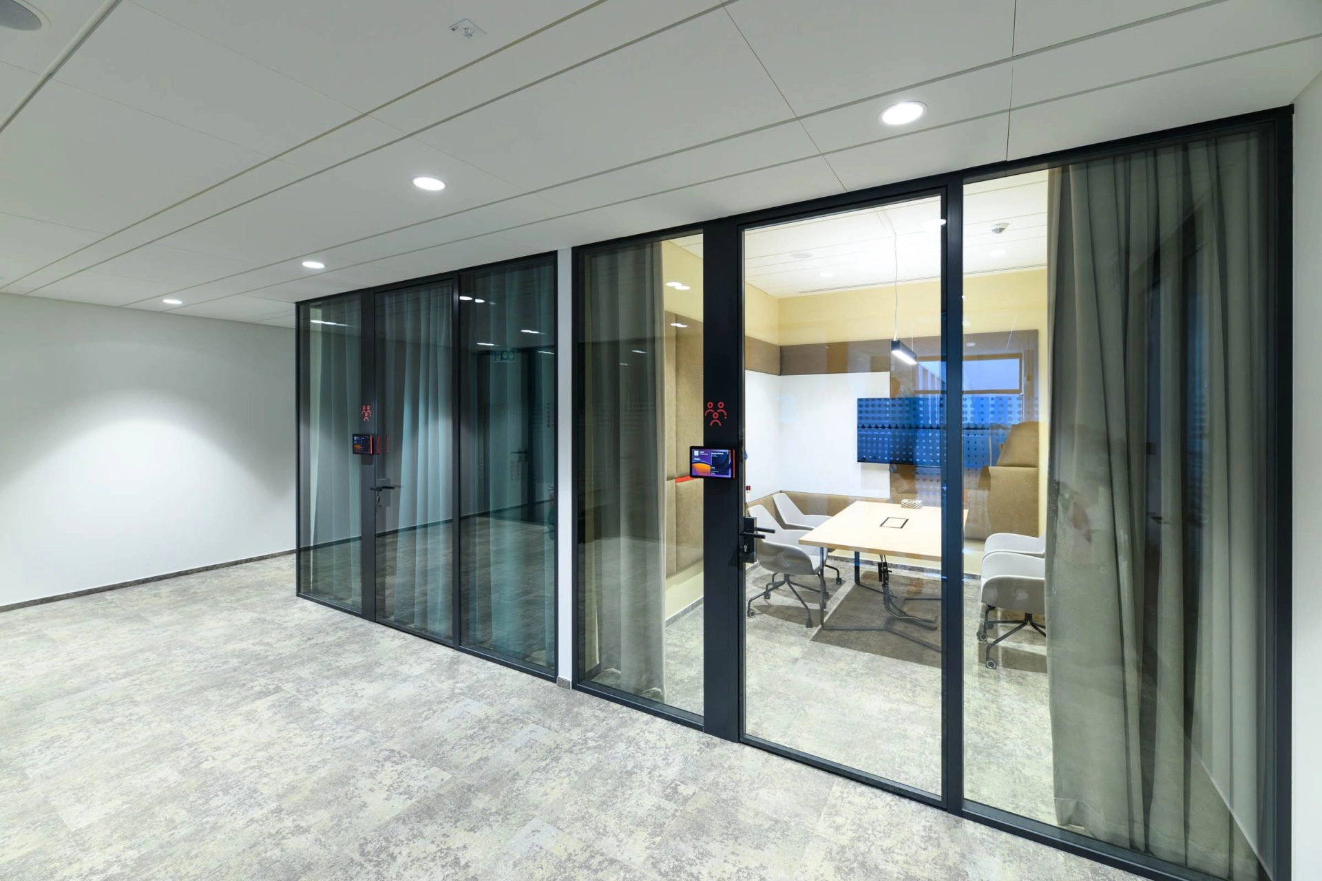 🔴 Krásně barevně laděné zasedací místnosti s dvojsklem, integrované vstupní tablety pro rezervaci místnosti a informace
