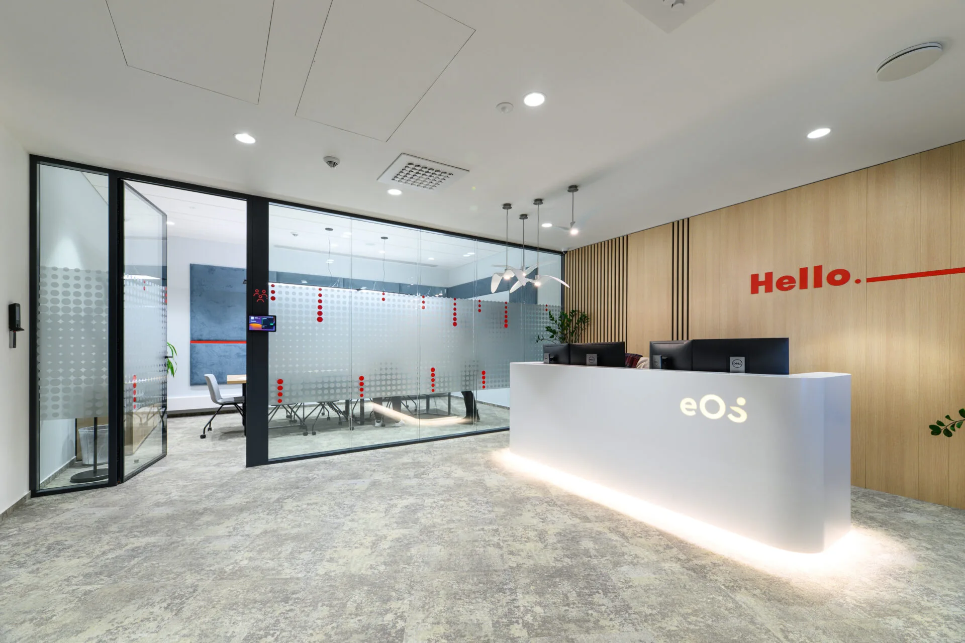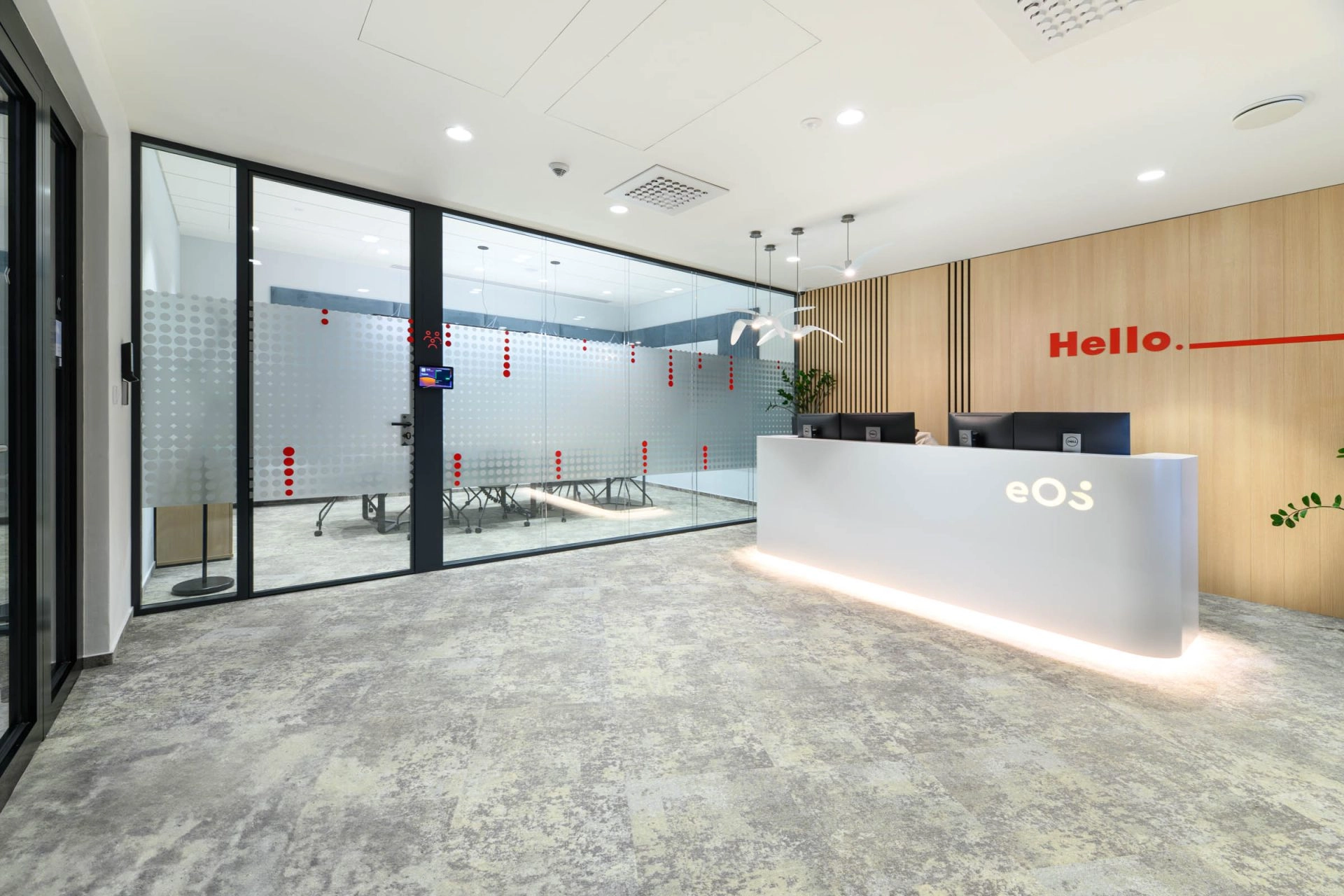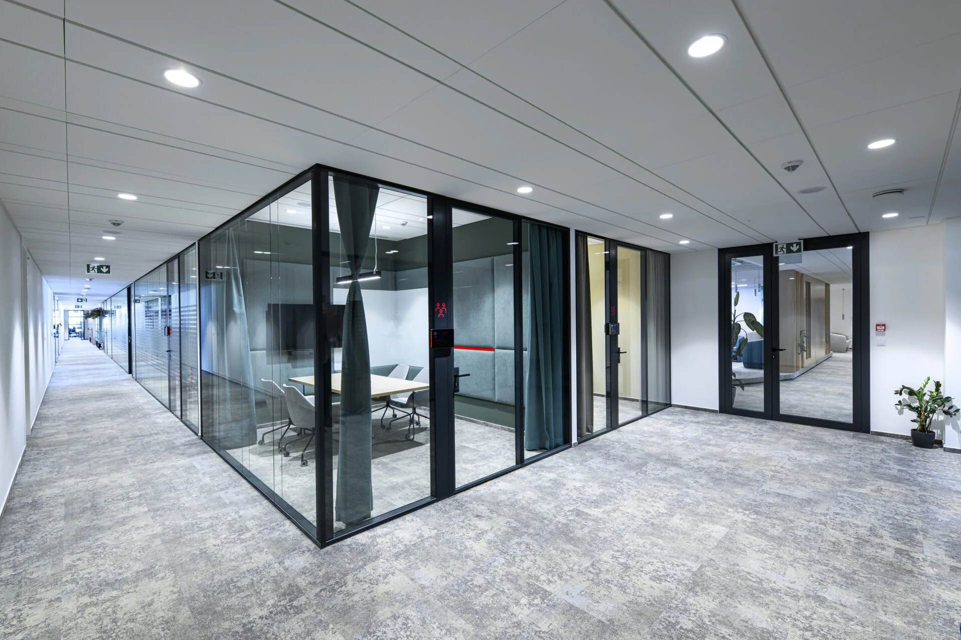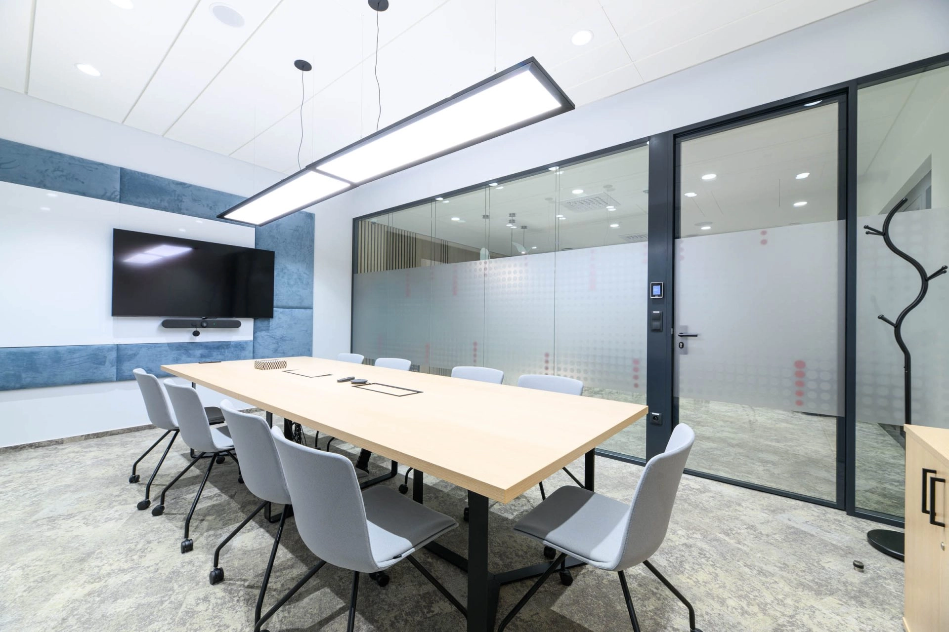 🔴 Krásně barevně laděné zasedací místnosti s dvojsklem, integrované vstupní tablety pro rezervaci místnosti a informace