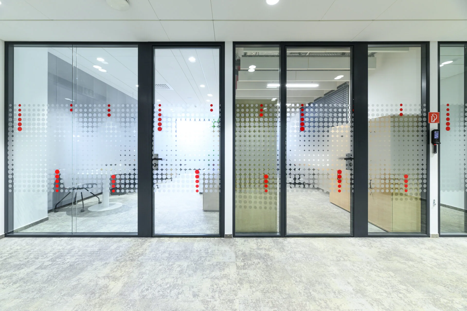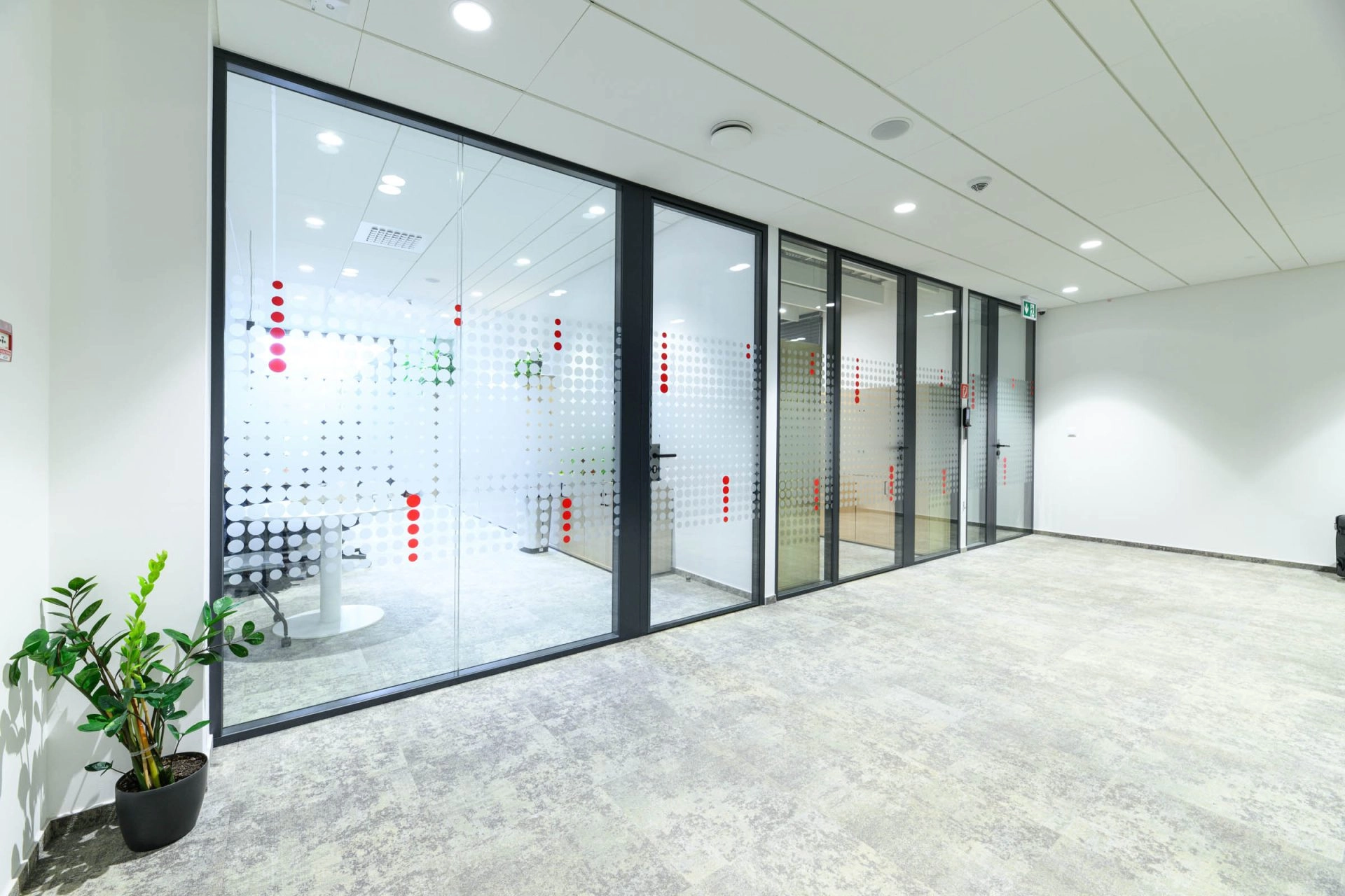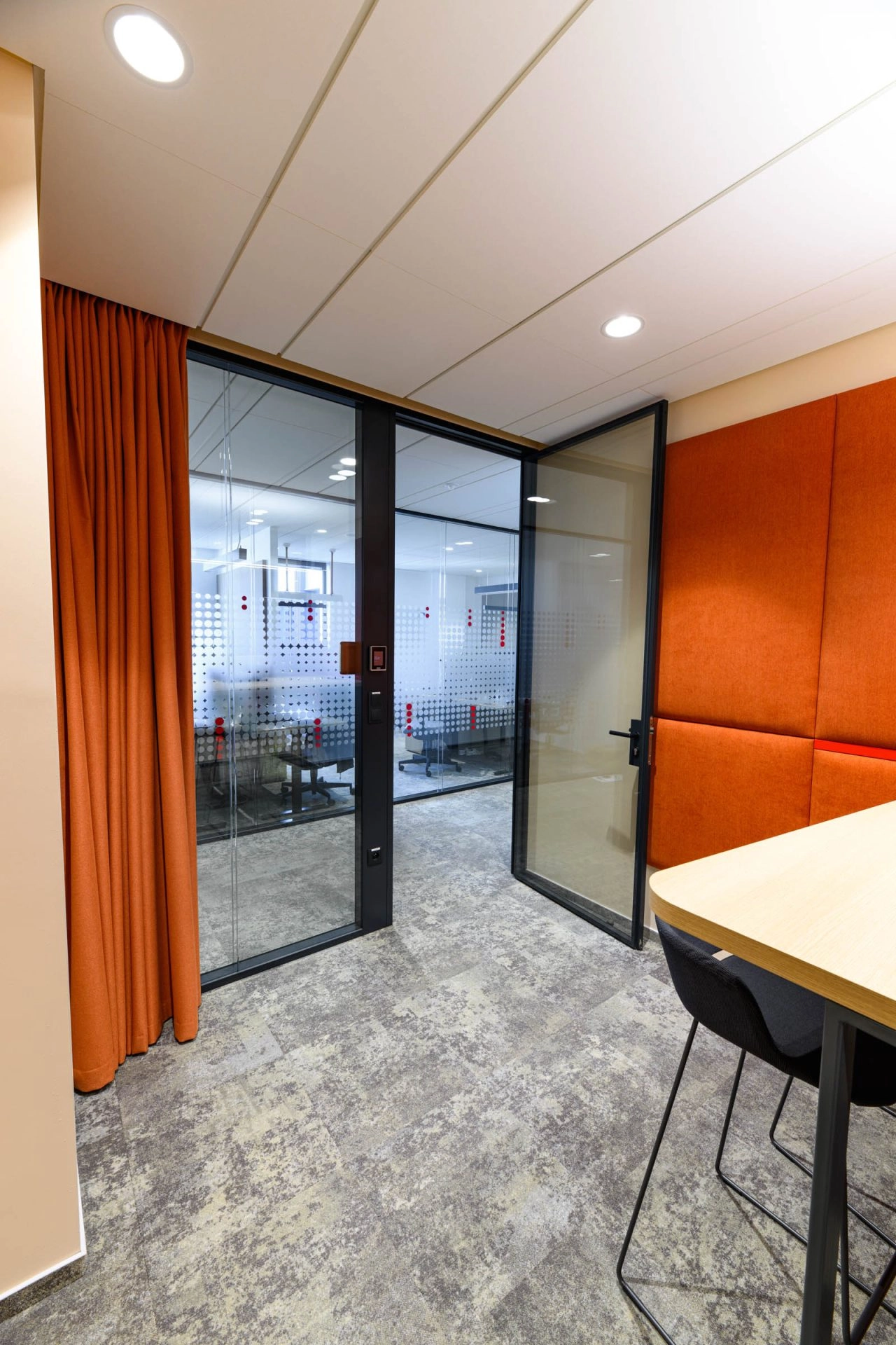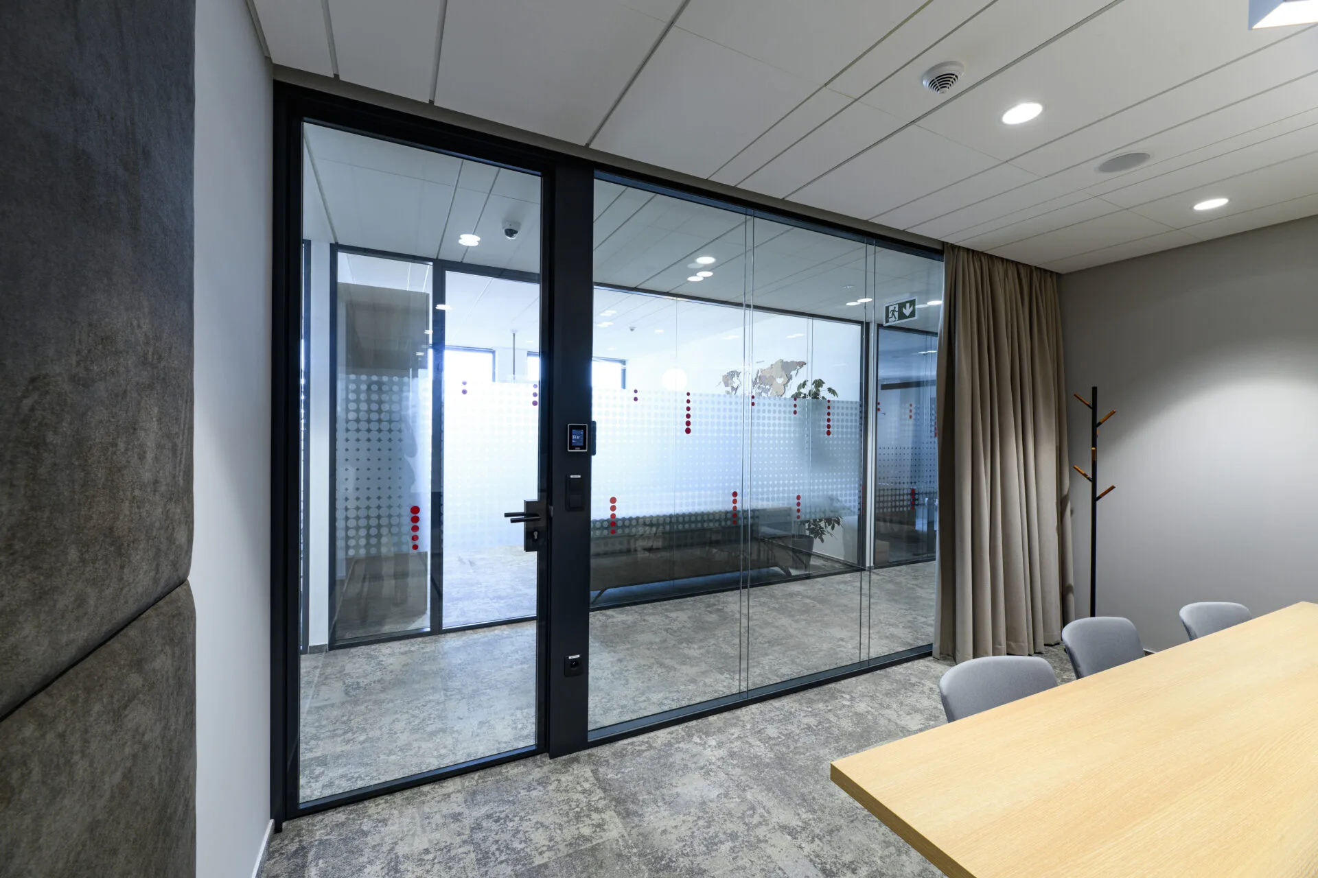 🔴 Krásně barevně laděné zasedací místnosti s dvojsklem, integrované vstupní tablety pro rezervaci místnosti a informace