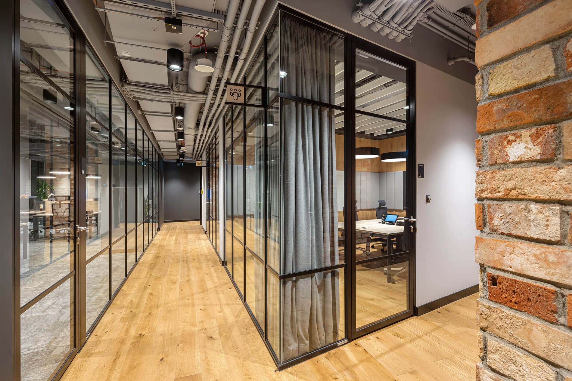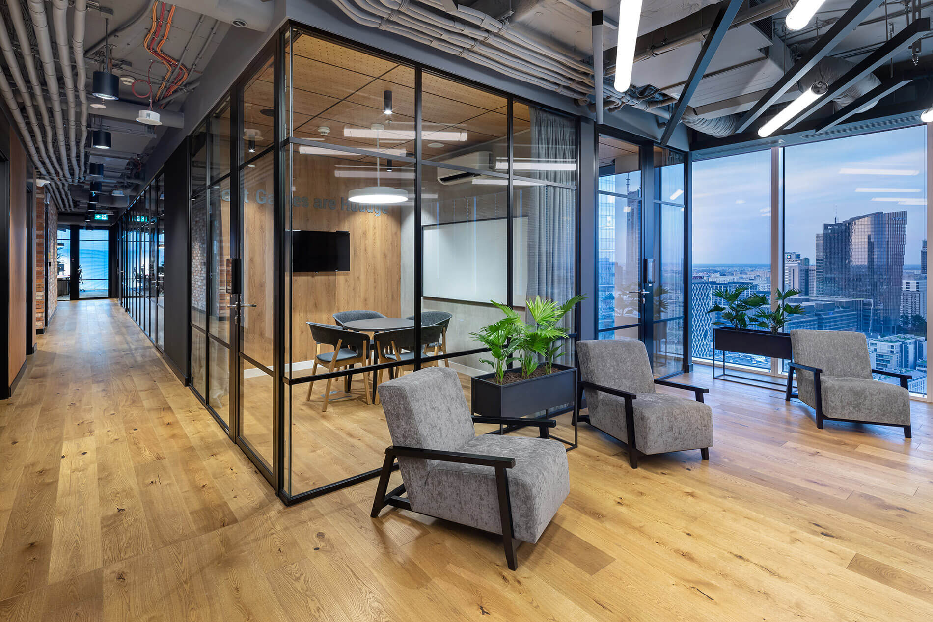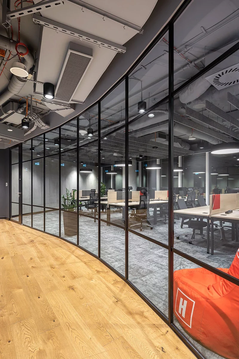 Kanceláře Huuuge Games jsou navrženy v loftovém stylu a nabízejí příjemné a pohodlné prostředí pro zaměstnance i jejich klienty a spolupracovníky. Prosklené příčky GS I. Grid s mřížkovým designem skvěle doplňují industriální charakter prostoru.