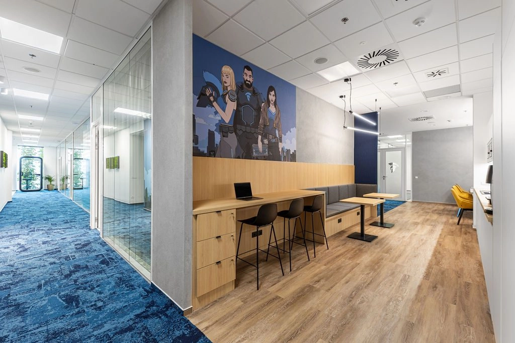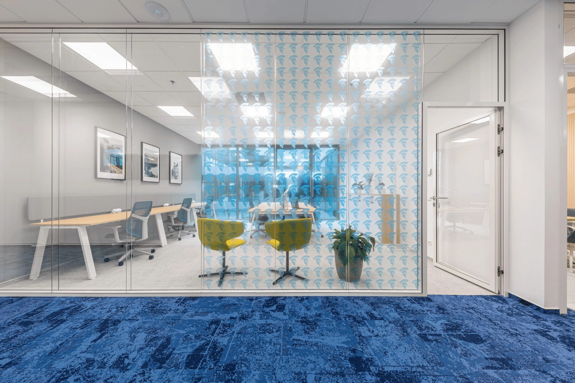 Polepy s motivem loga prostor vizuálně sjednocují a zároveň podporují firemní identitu.