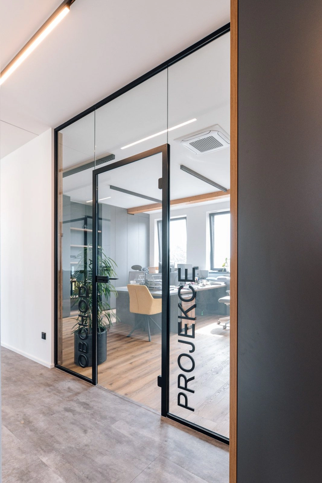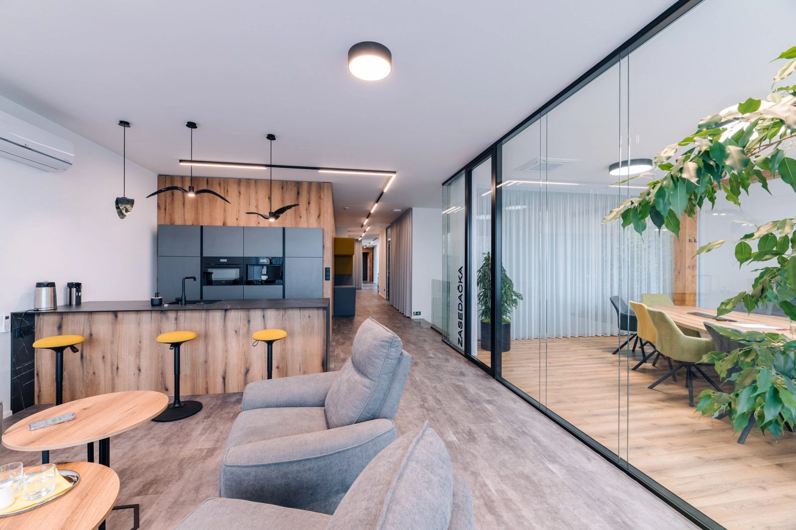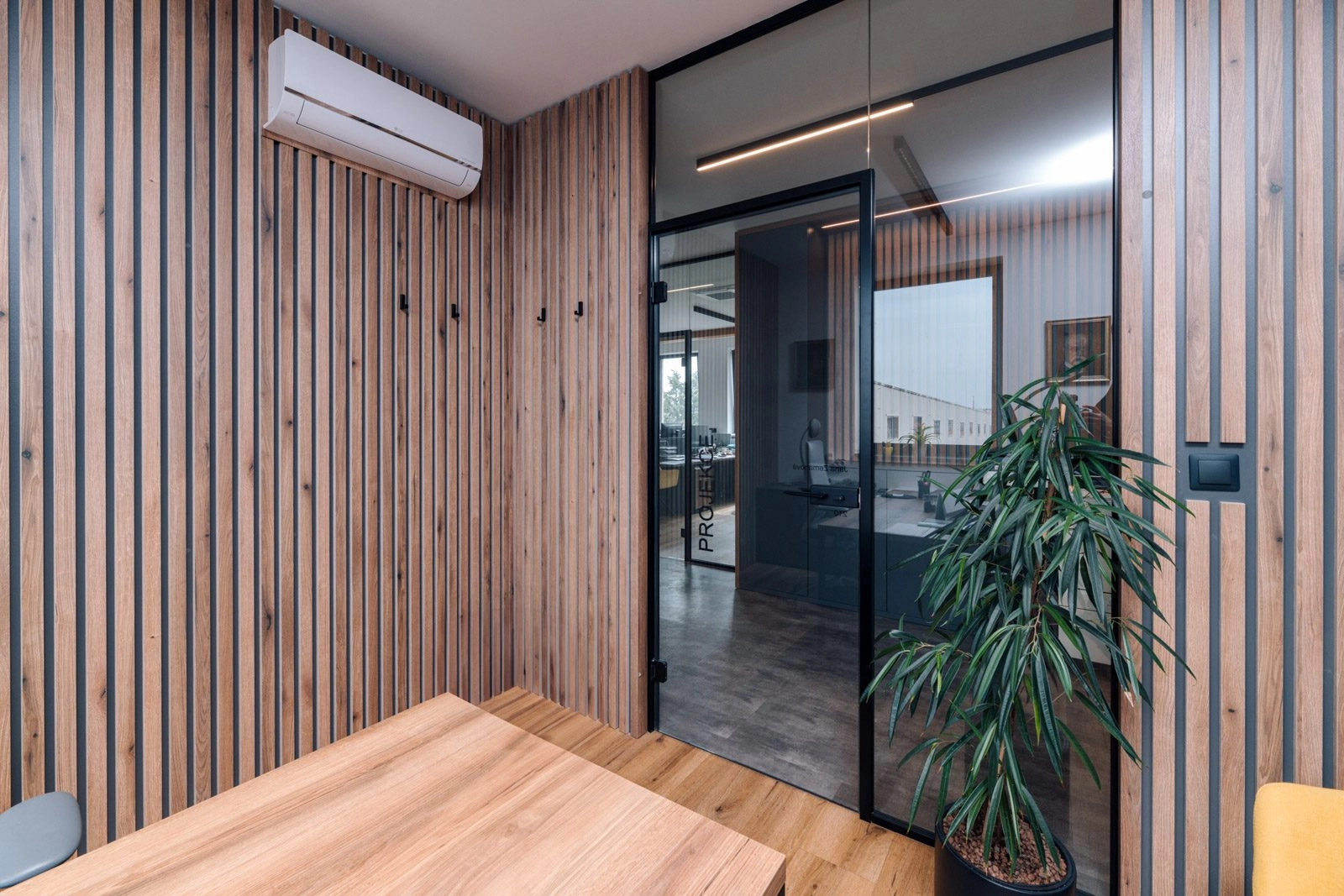 🌿 Kanceláře doplňují dřevěné obklady a jednoduše prosklené příčky, které prostor opticky otevírají.
