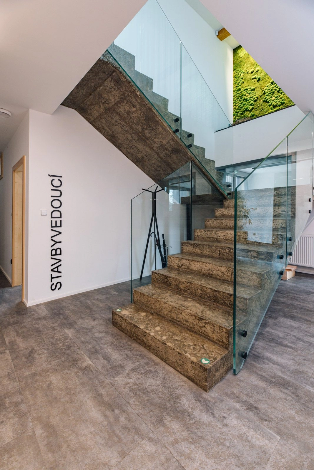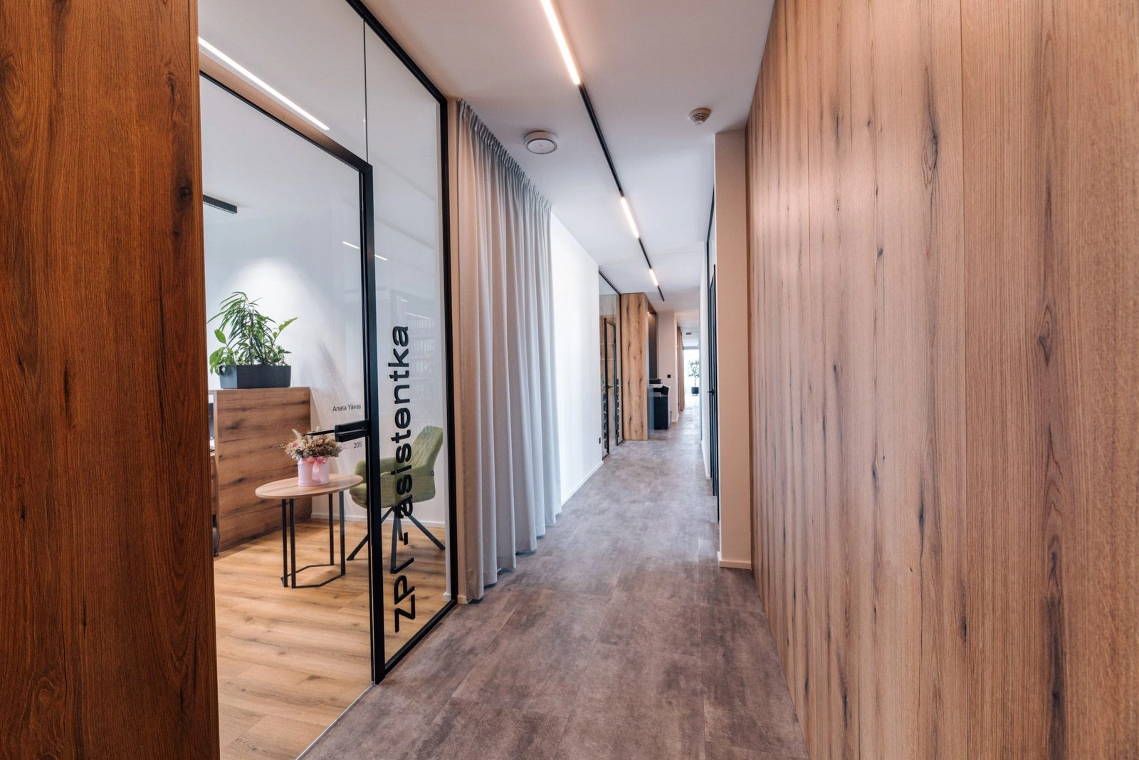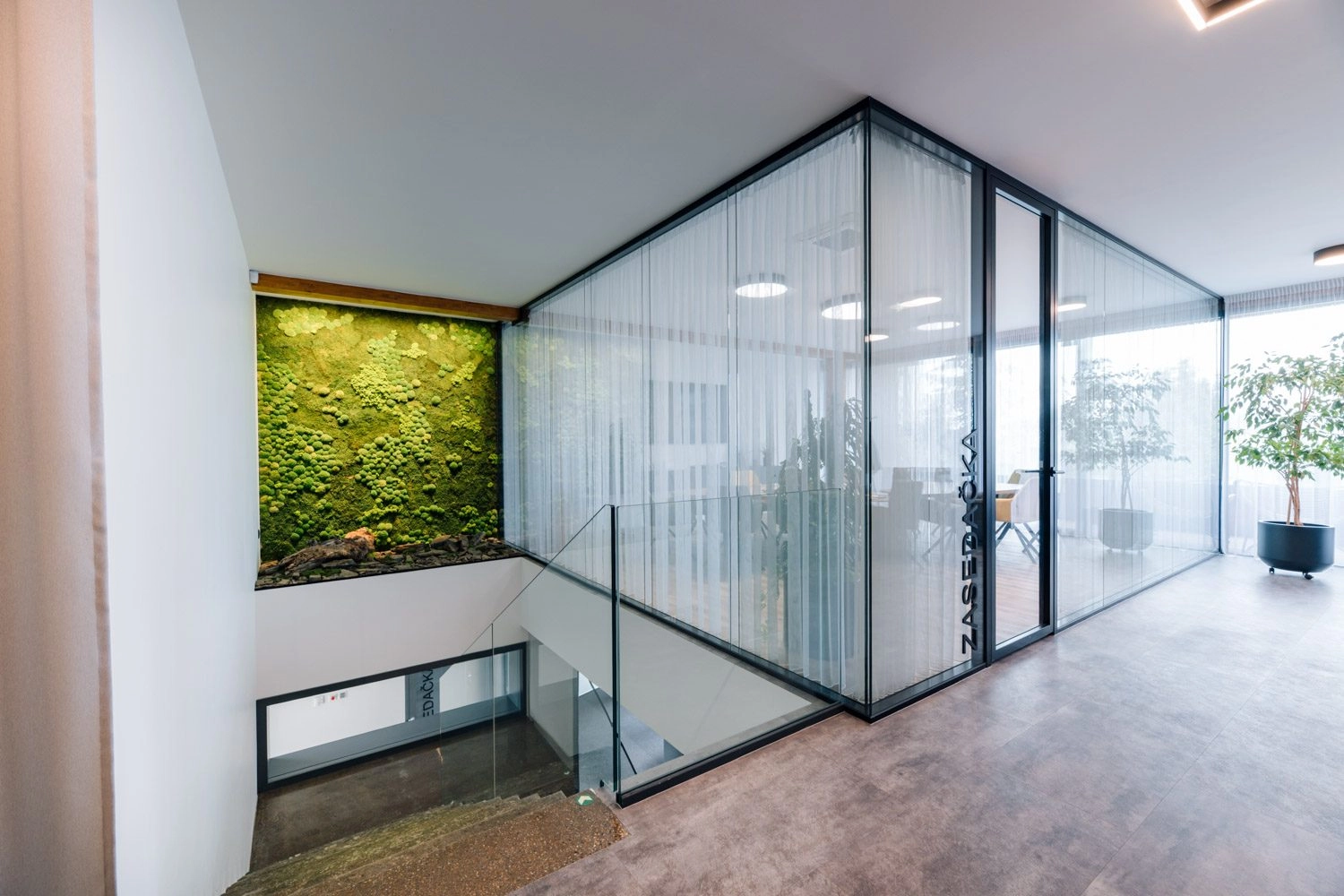 🌿 Kanceláře doplňují dřevěné obklady a jednoduše prosklené příčky, které prostor opticky otevírají.