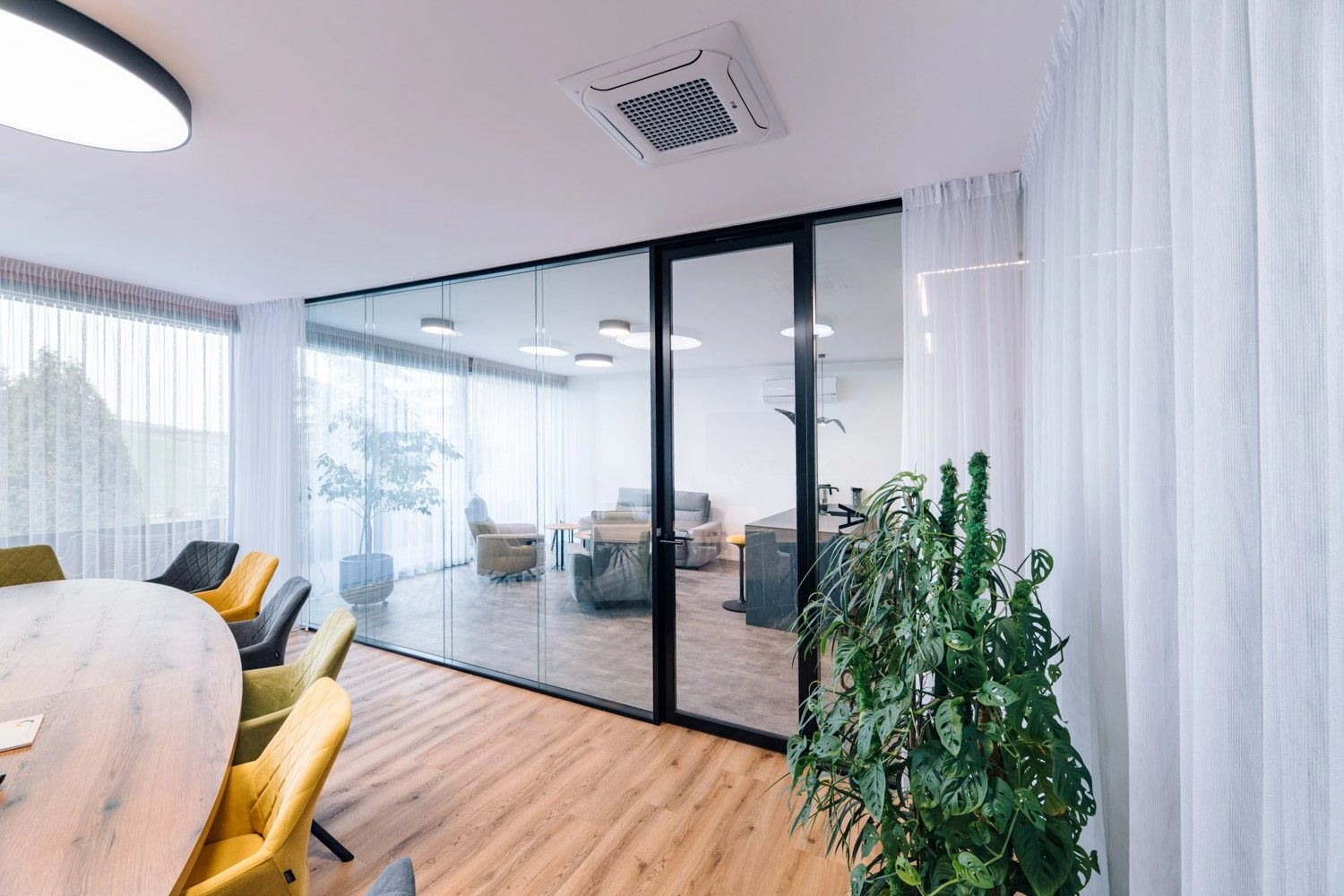 🌿 Zasedací místnost dýchá pohodou díky kombinaci akustického komfortu dvojskla, praktických záclon a přírodních prvků – dřeva, rostlin, židlí v zemitých tónech.