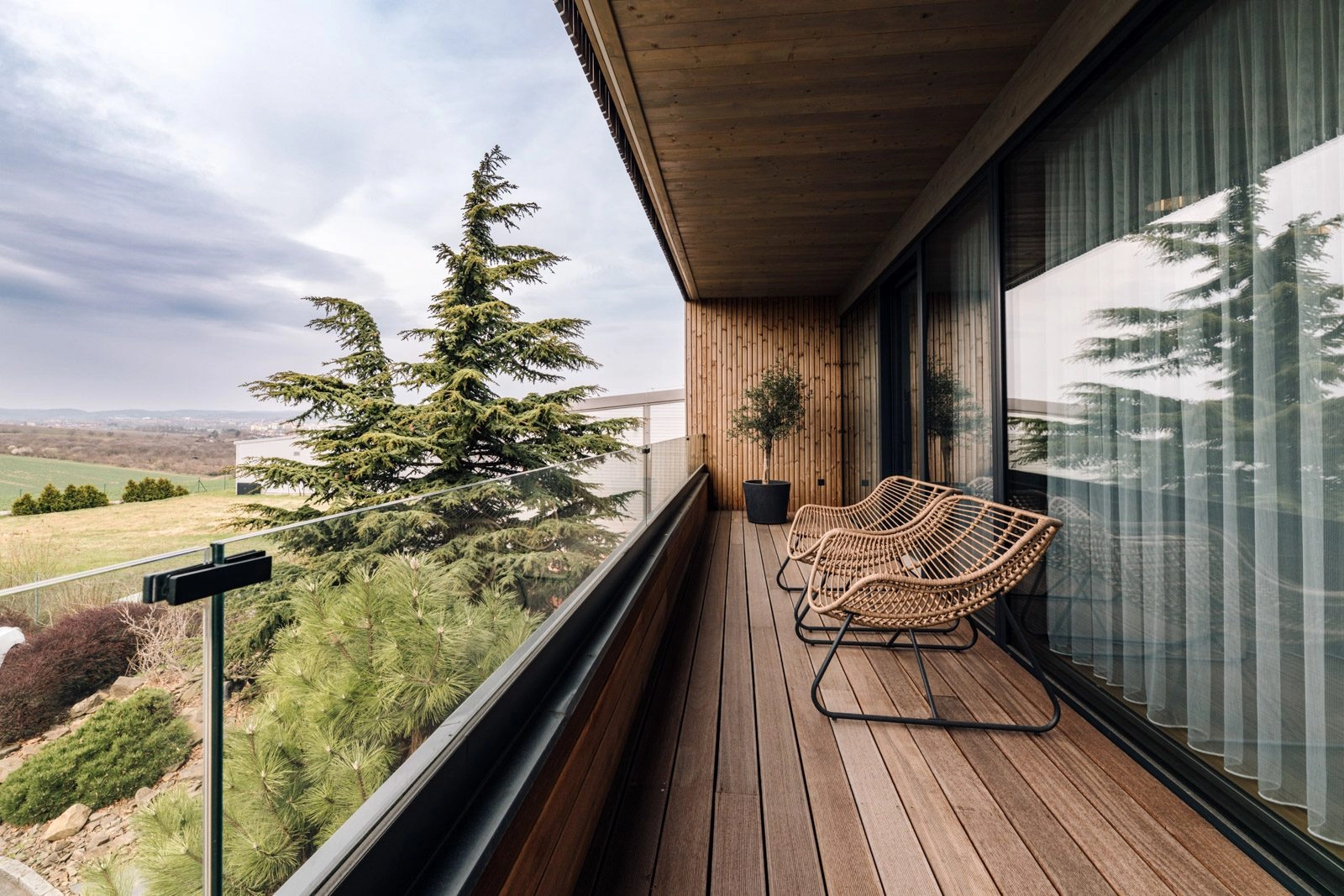 🌿 Interiérové i exteriérové skleněné zábradlí dodává projektu čistý a elegantní vzhled, a to na schodištích i na terase.