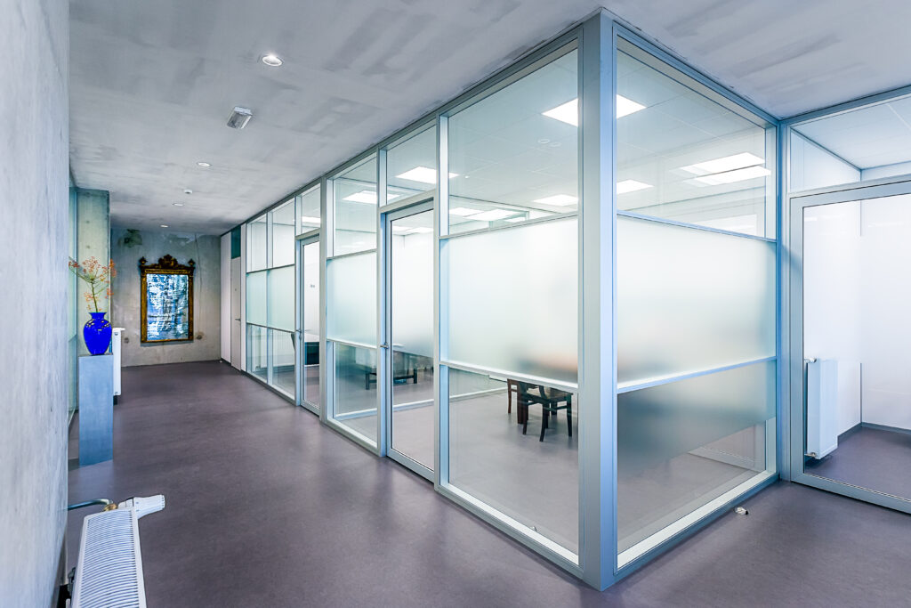 Tieto sklenené priečky s mriežkovým vzhľadom spájajú moderný priemyselný dizajn s dokonalou zvukovou izoláciou. Dvojité zasklenie a precízna konštrukcia zabezpečujú vynikajúcu zvukovú izoláciu a vytvárajú tiché pracovné prostredie aj v rušných priestoroch.