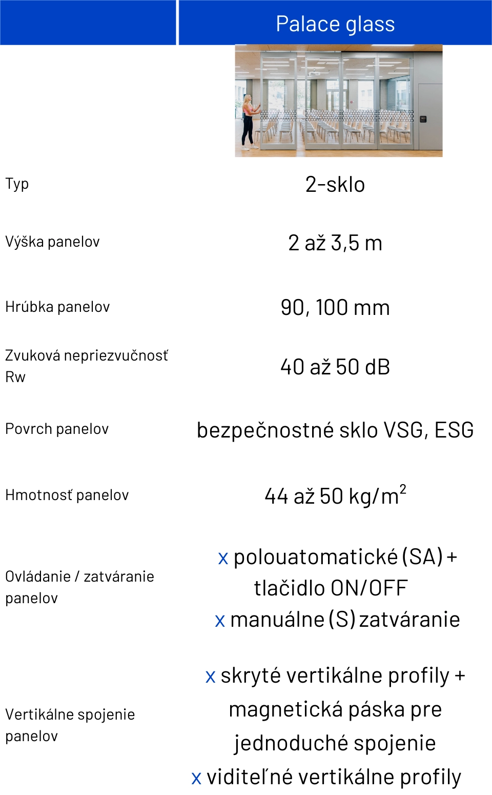 Stena je určená na flexibilné rozdelenie miestností, ako sú zasadacie miestnosti, kancelárie, školské učebne alebo reprezentatívne priestory, kde je dôležitý moderný vzhľad a funkčnosť. Panely s výškou do 3,5 metra sa pohybujú plynulo a ticho. Vďaka svojmu transparentnému dizajnu nezaťažujú priestor a zachovávajú vzdušnosť interiéru.
