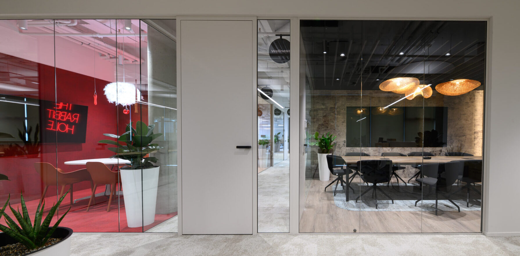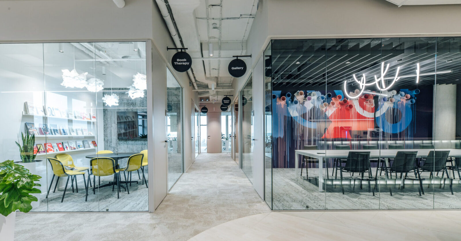 Nachádza sa tu galéria, wellness a kozmetický salón, zvukové štúdio a kabaret s pouličným pútačom. Zasadačky sme oddelili sklenenými stenami a sklenená stena z textúrovaného skla Raywall elegantne uzatvára relaxačnú zónu so stolným futbalom.