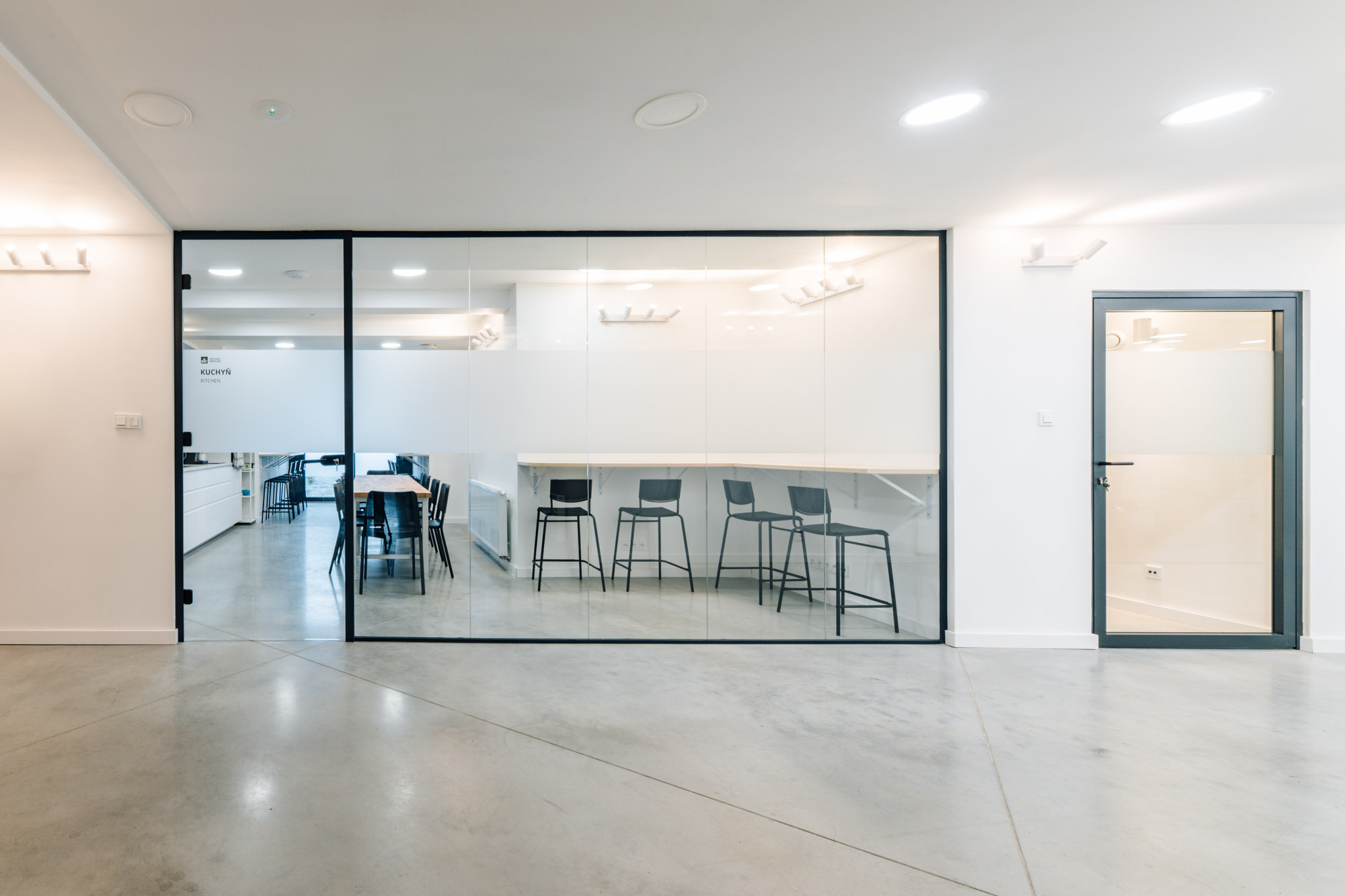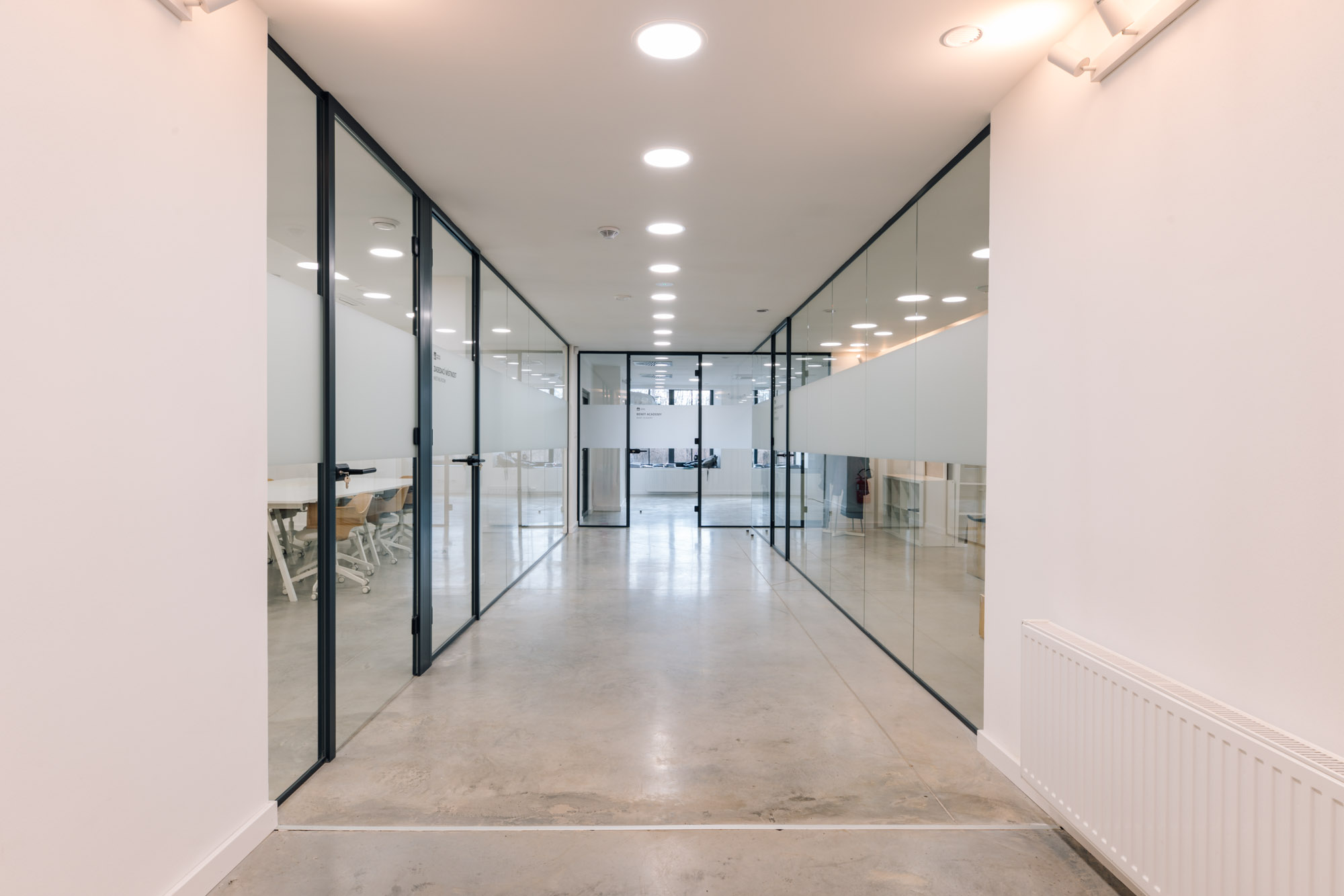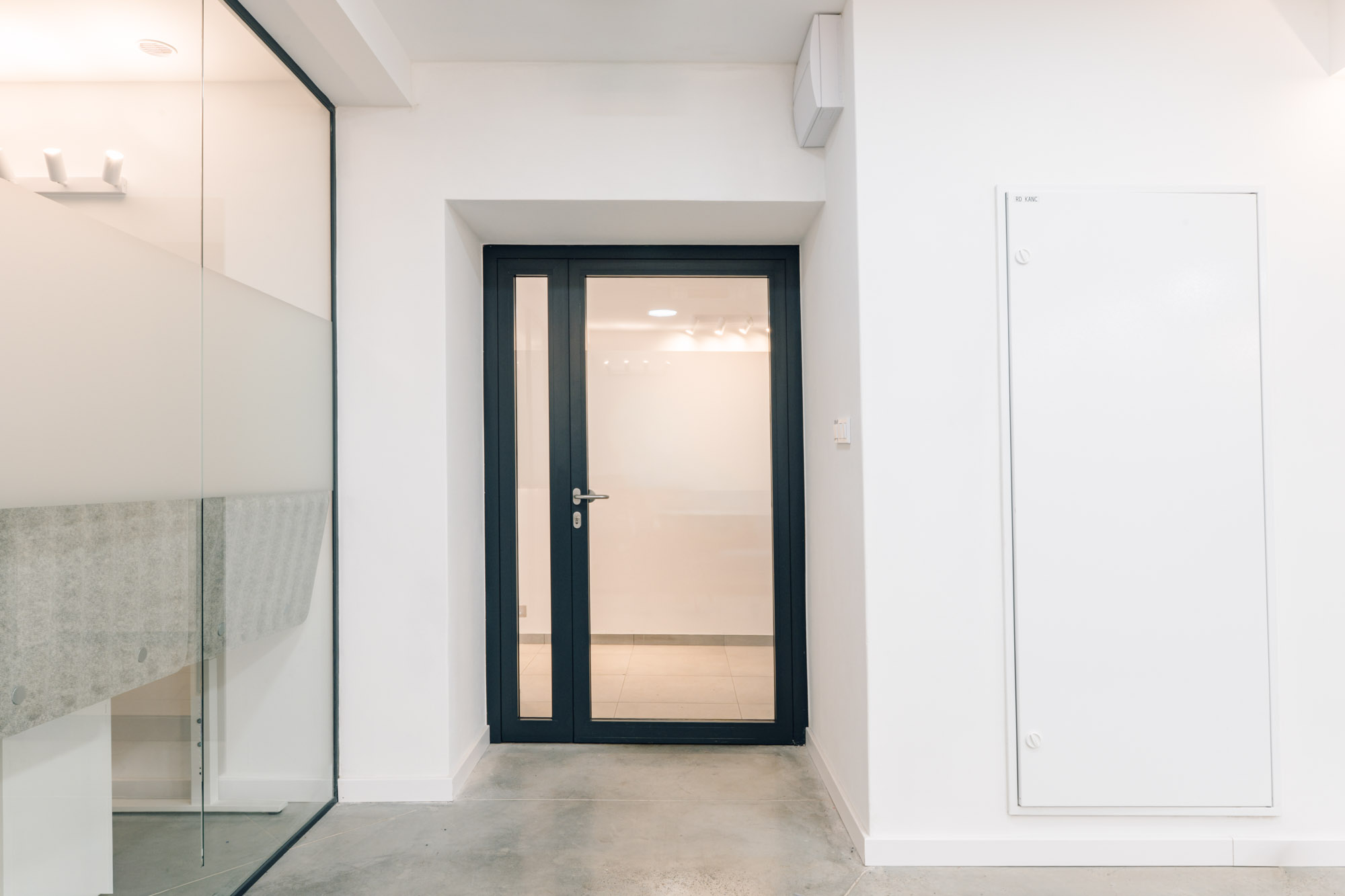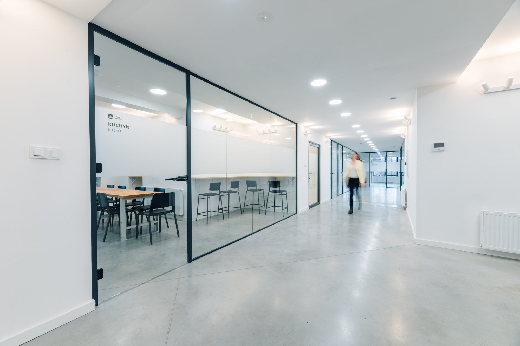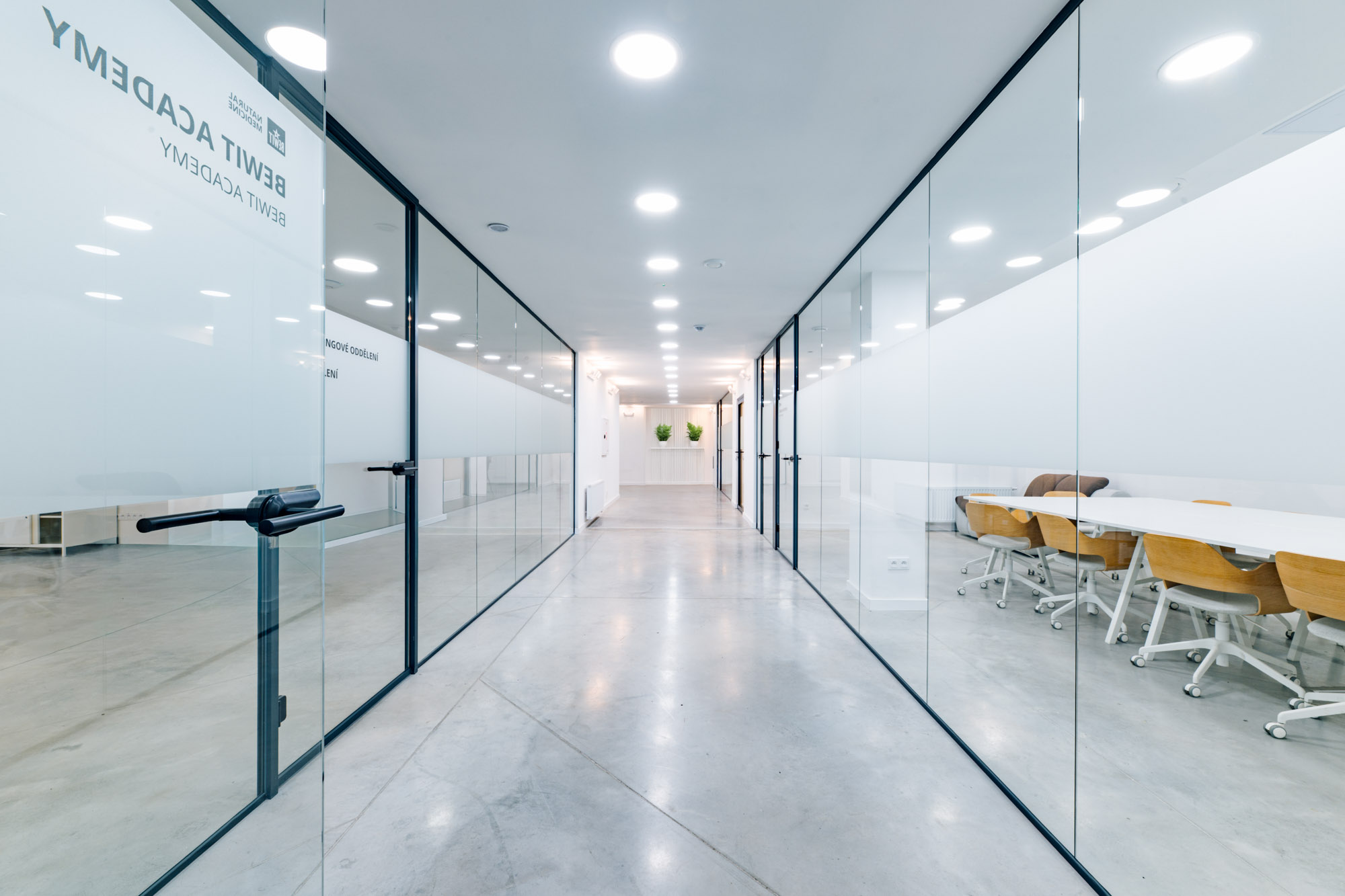 V Bewitu jsme vytvořili moderní prostor s jednoduchými prosklenými stěnami, kombinující bezrámové i rámové dveře. U vstupu jsme zároveň instalovali protipožární dveře, které zajišťují bezpečnost bez kompromisů v designu.
