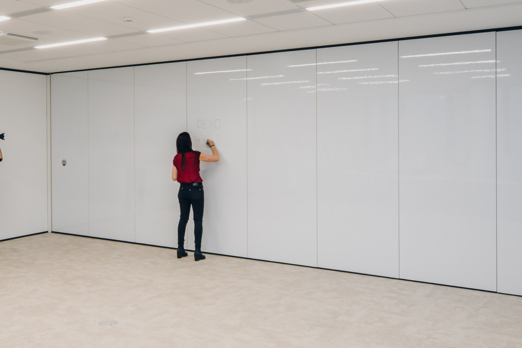 Stena je vybavená popisovateľnou fóliou, vďaka ktorej slúži aj ako praktická tabuľa na workshopy a prezentácie.