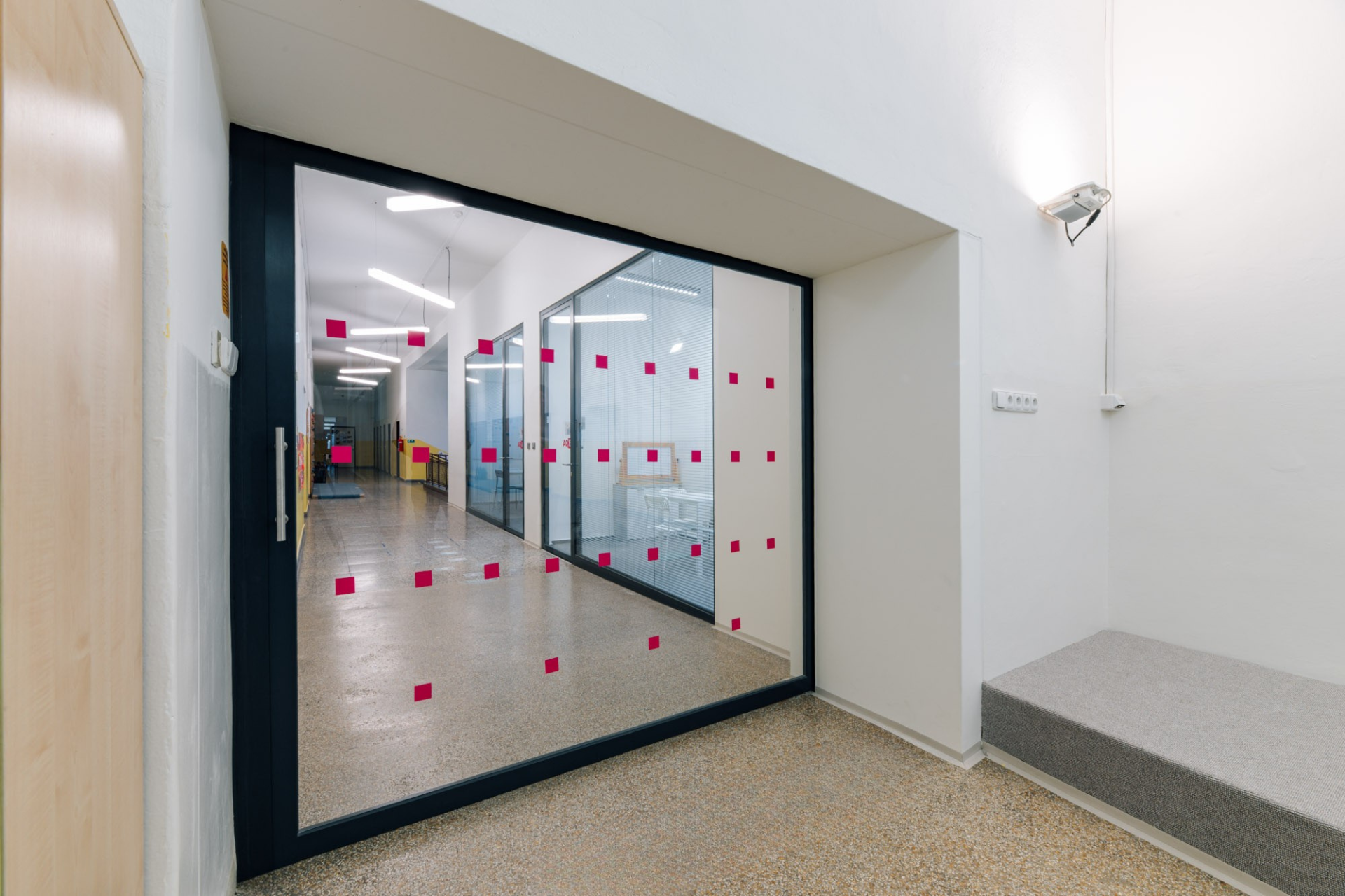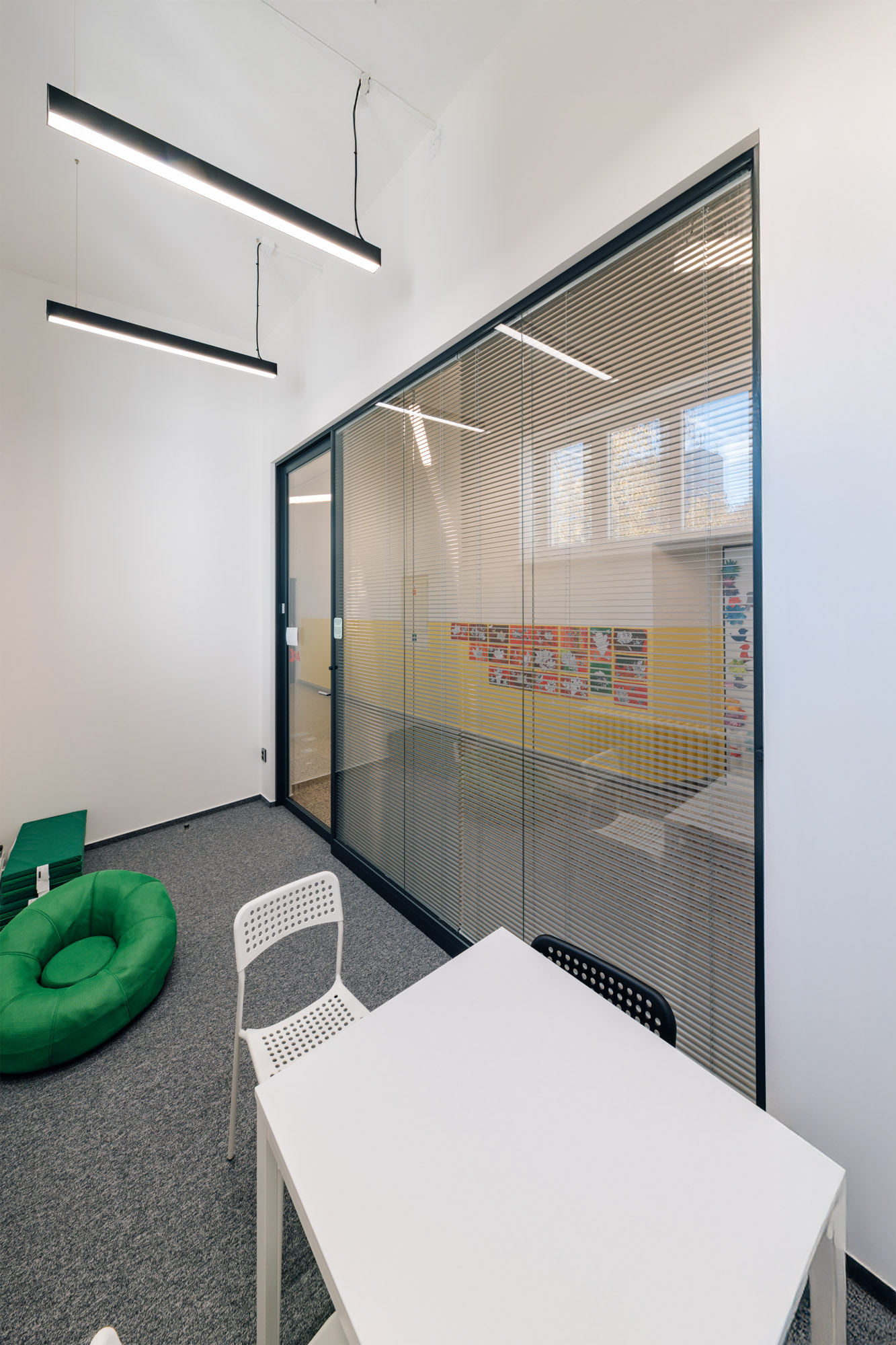 Vzniklo místo přezdívané „akvárko“, které si rychle oblíbili žáci i učitelé. Díky vnitřním žaluziím a zvukové neprůzvučnosti až 43 dB je zajištěno vysoké soukromí i akustický komfort.